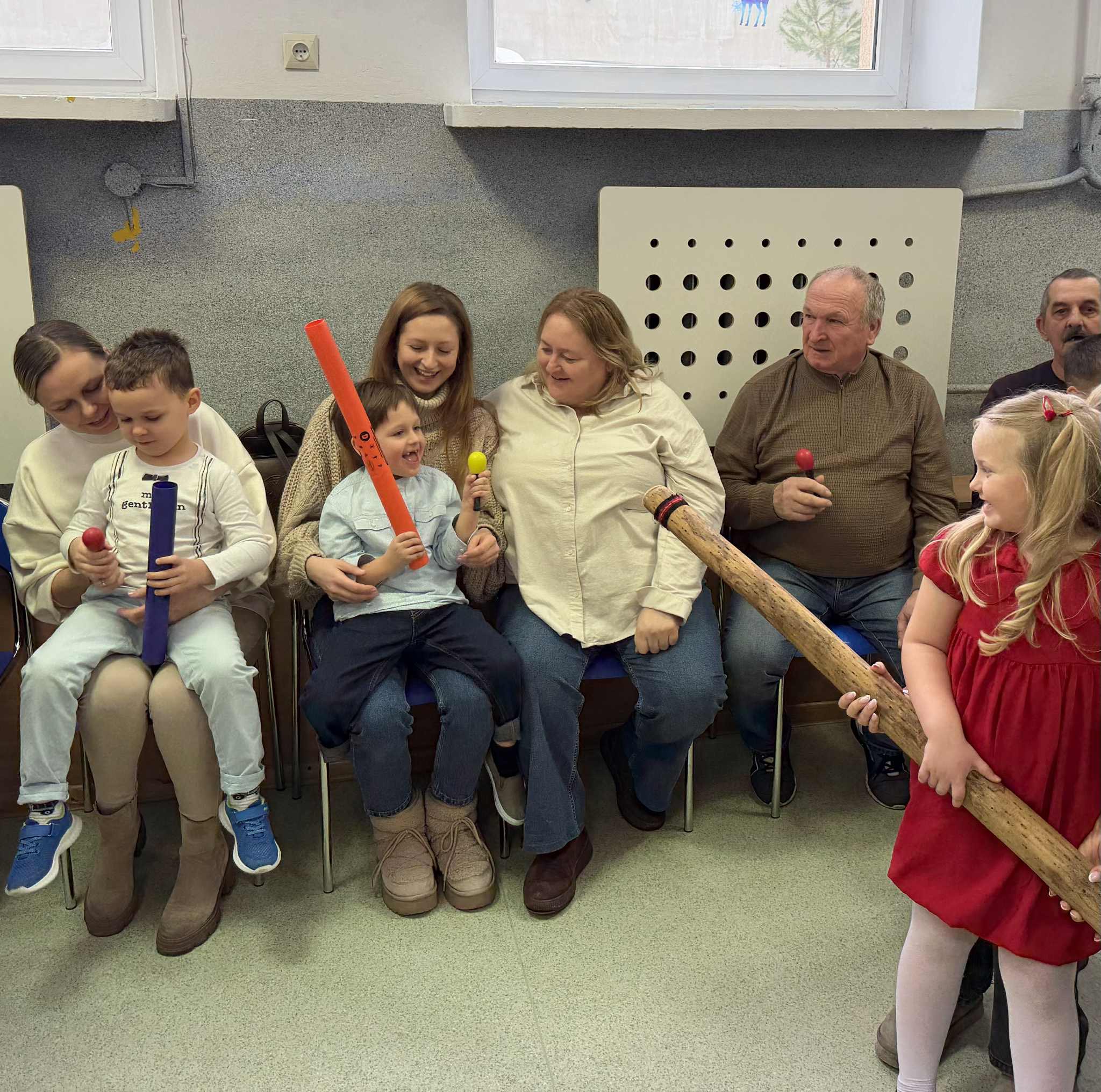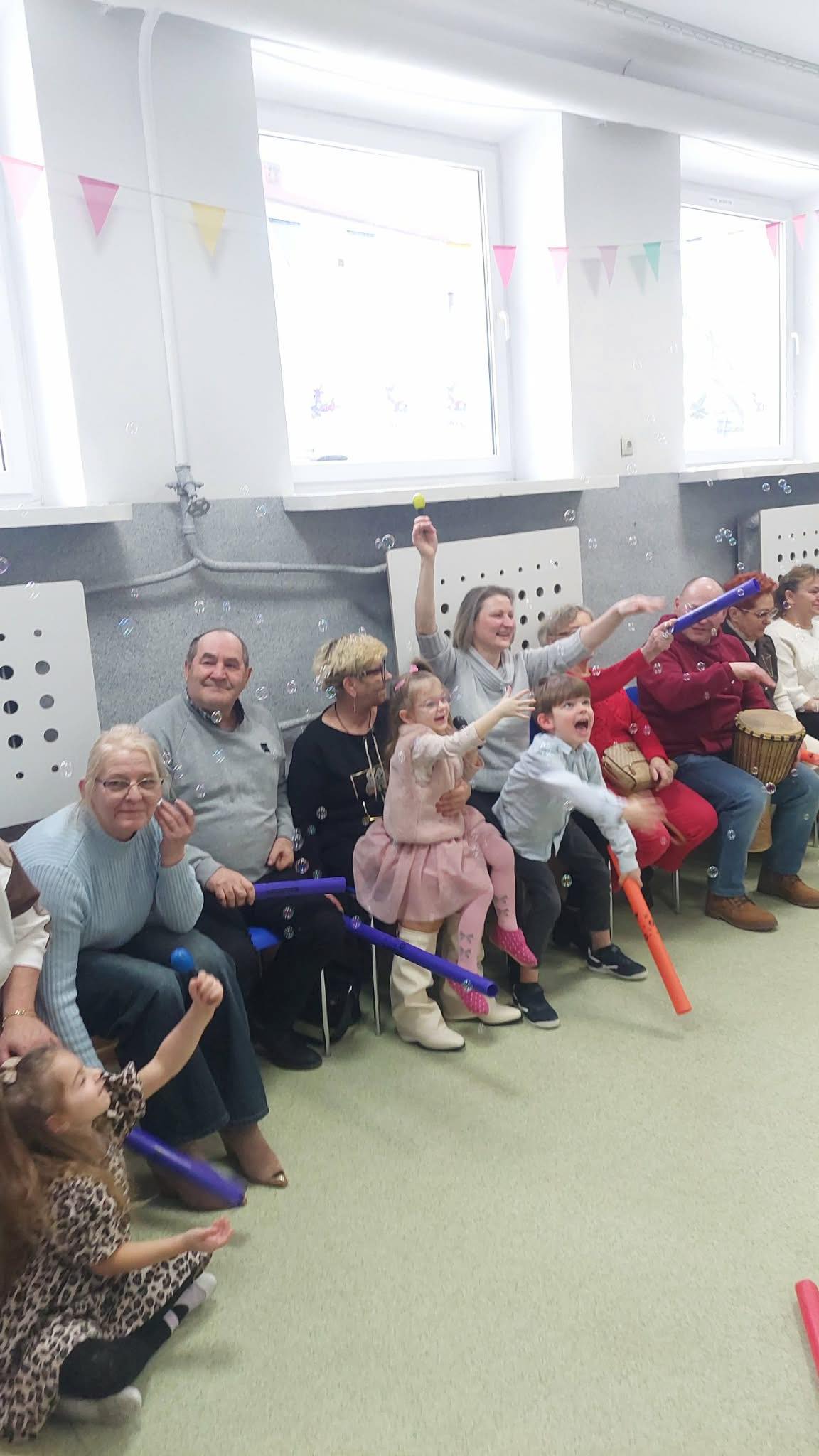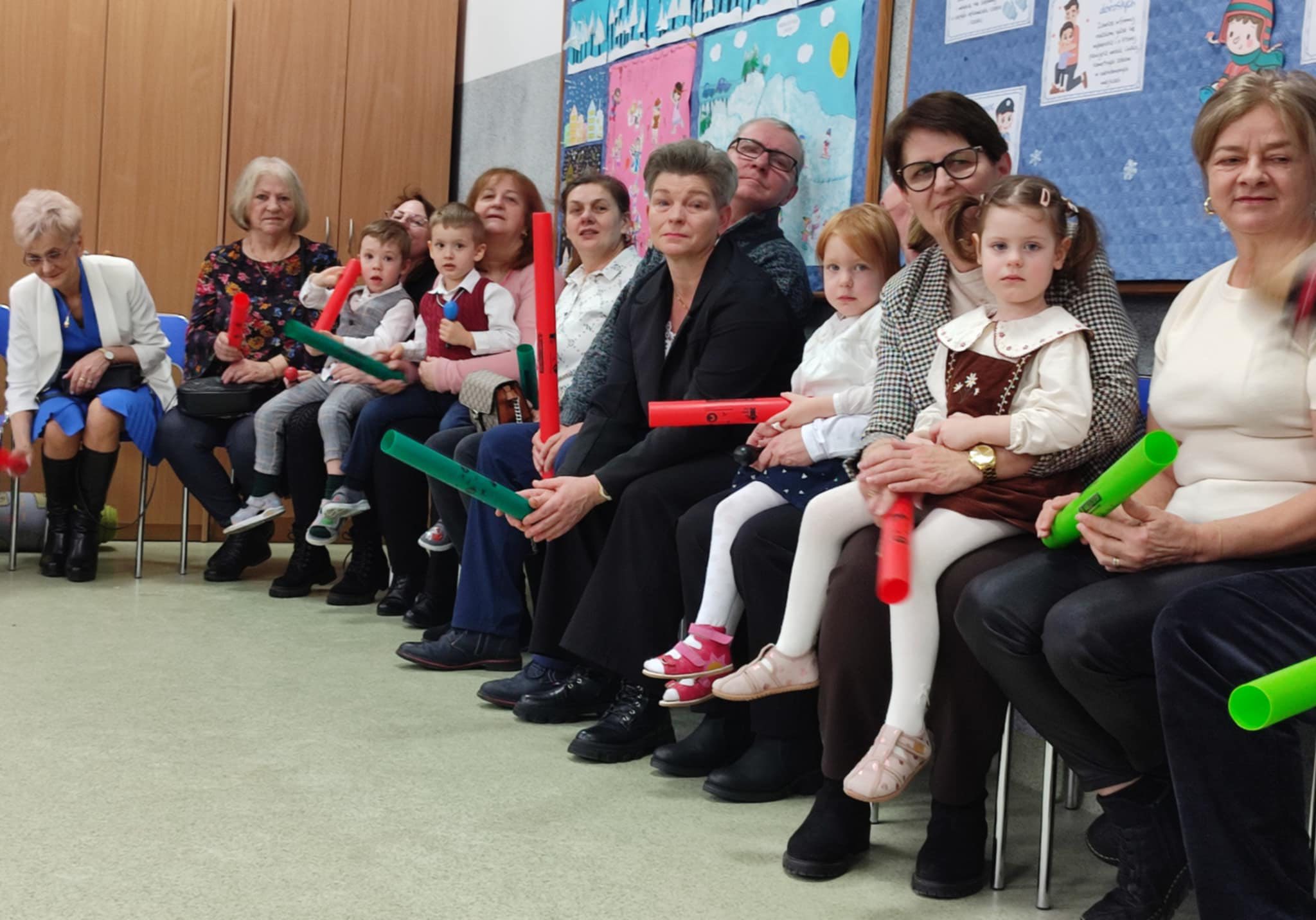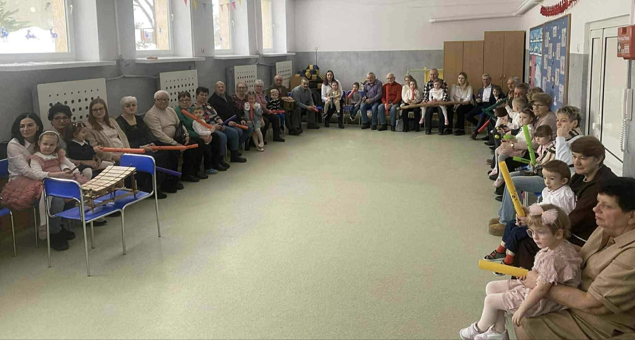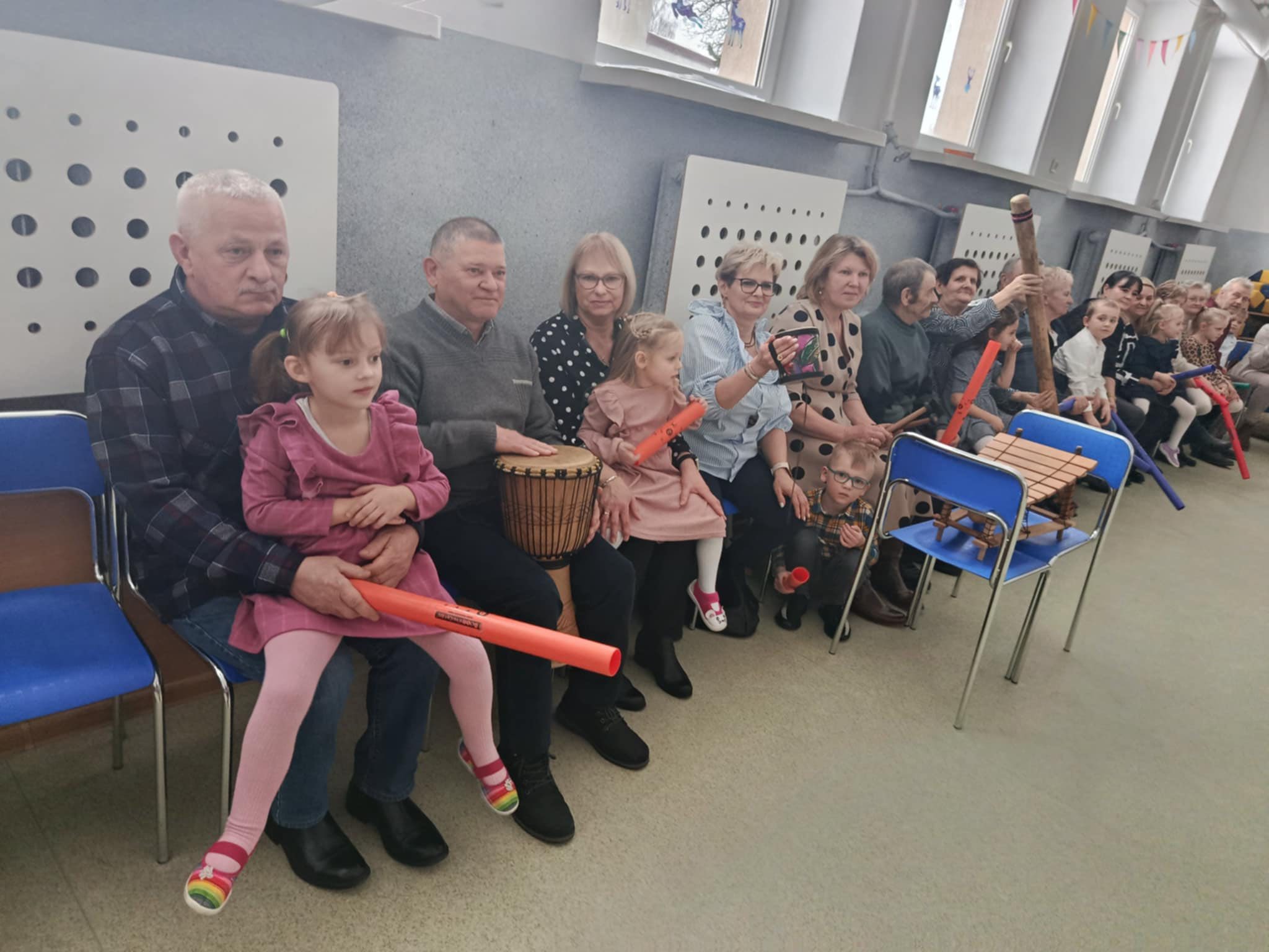 Z okazji Dnia Babci i Dziadka w naszym przedszkolu, odbyły się wyjątkowe warsztaty muzyczne pt: „Muzyka łączy pokolenia”, których celem było wspólne świętowanie oraz integracja międzypokoleniowa. Babcie i Dziadkowie przybyli licznie, aby w radosnej i ciepłej atmosferze spędzić czas ze swoimi wnukami. Nasi wyjątkowi goście, zostali zaproszeni do udziału w warsztatach muzycznych, podczas których wspólnie odkrywali radość płynącą z muzykowania. Wspólne zabawy rytmiczne, śpiew oraz tworzenie prostych akompaniamentów sprzyjały budowaniu więzi, rozwijaniu wrażliwości muzycznej oraz wzajemnemu zrozumieniu i współpracy między pokoleniami. To wyjątkowe spotkanie przebiegło w niezwykle serdecznej i rodzinnej atmosferze, pełnej wzruszeń i pozytywnych emocji. Następnie Babcie i Dziadkowie udali się do sal przedszkolnych na krótki program artystyczny, przygotowany przez dzieci. Mali artyści z wielkim zaangażowaniem śpiewali piosenki, recytowali wierszyki oraz wręczyli piękne, przygotowane własnoręcznie laurki. Serdecznie dziękujemy Rodzicom za zaangażowanie i współpracę oraz Panu Kamilowi Fałdowskiemu z „Moozomontowni” za przeprowadzenie warsztatów.