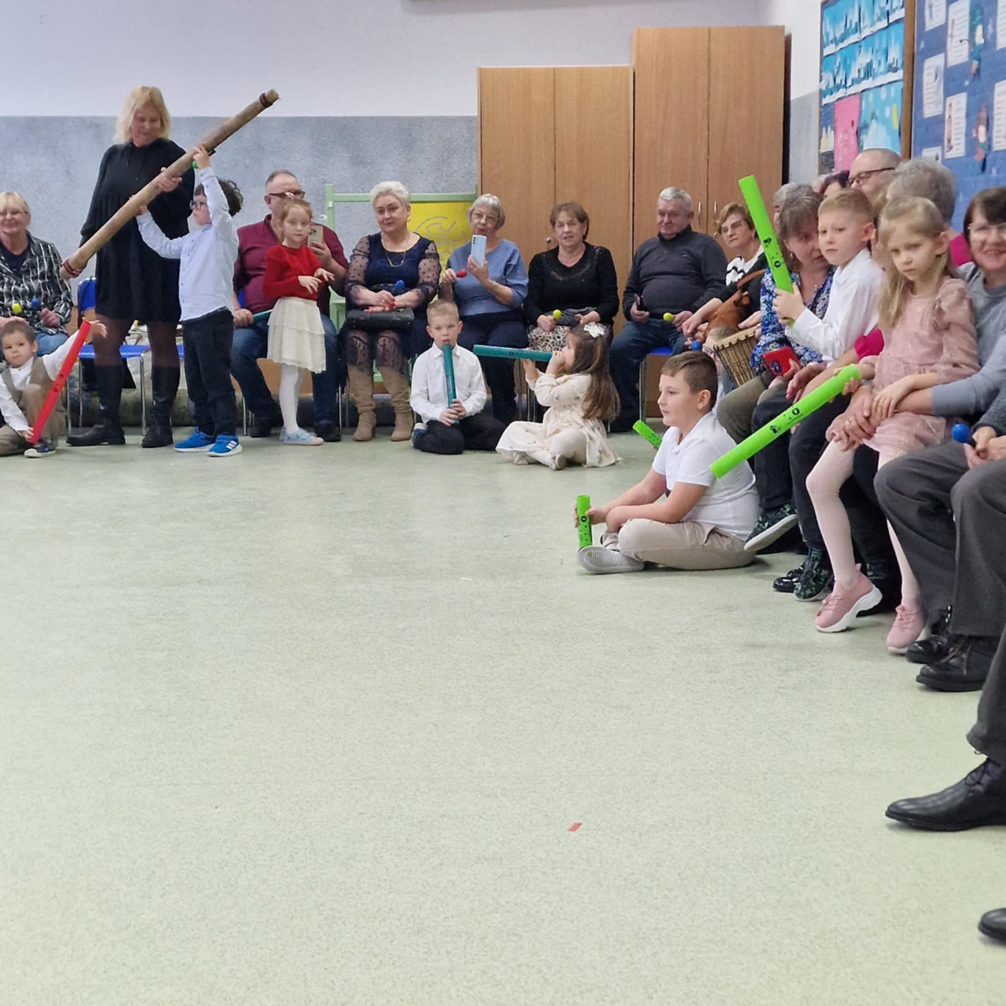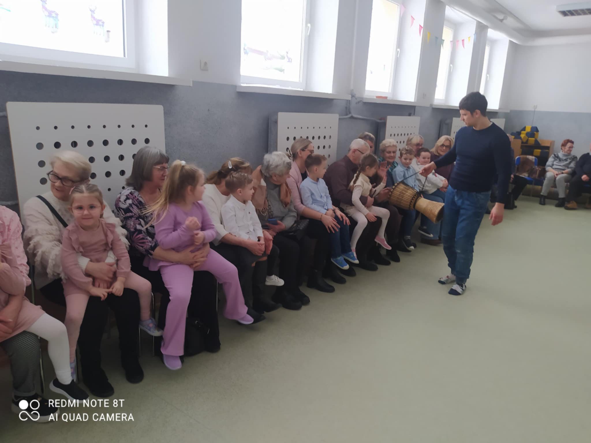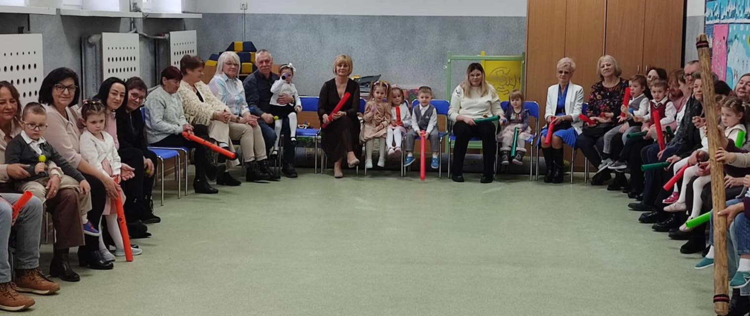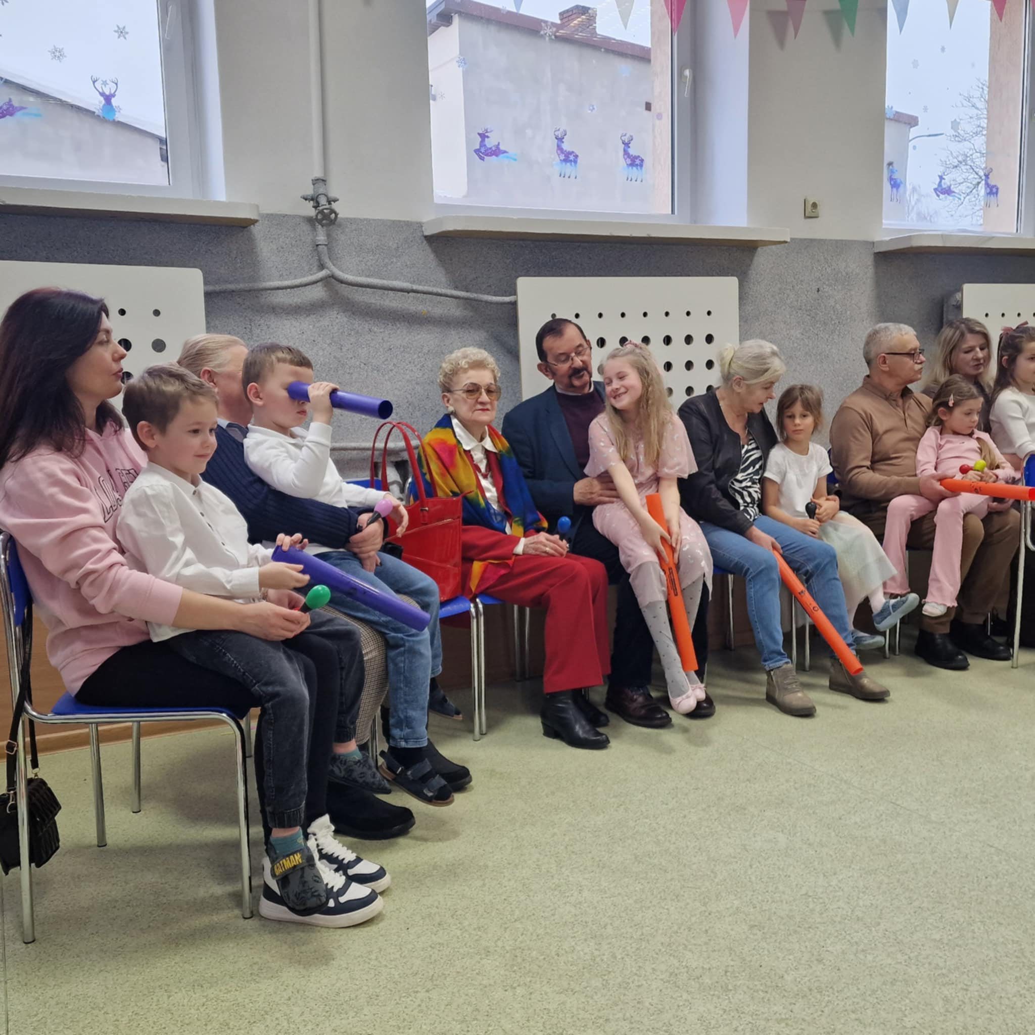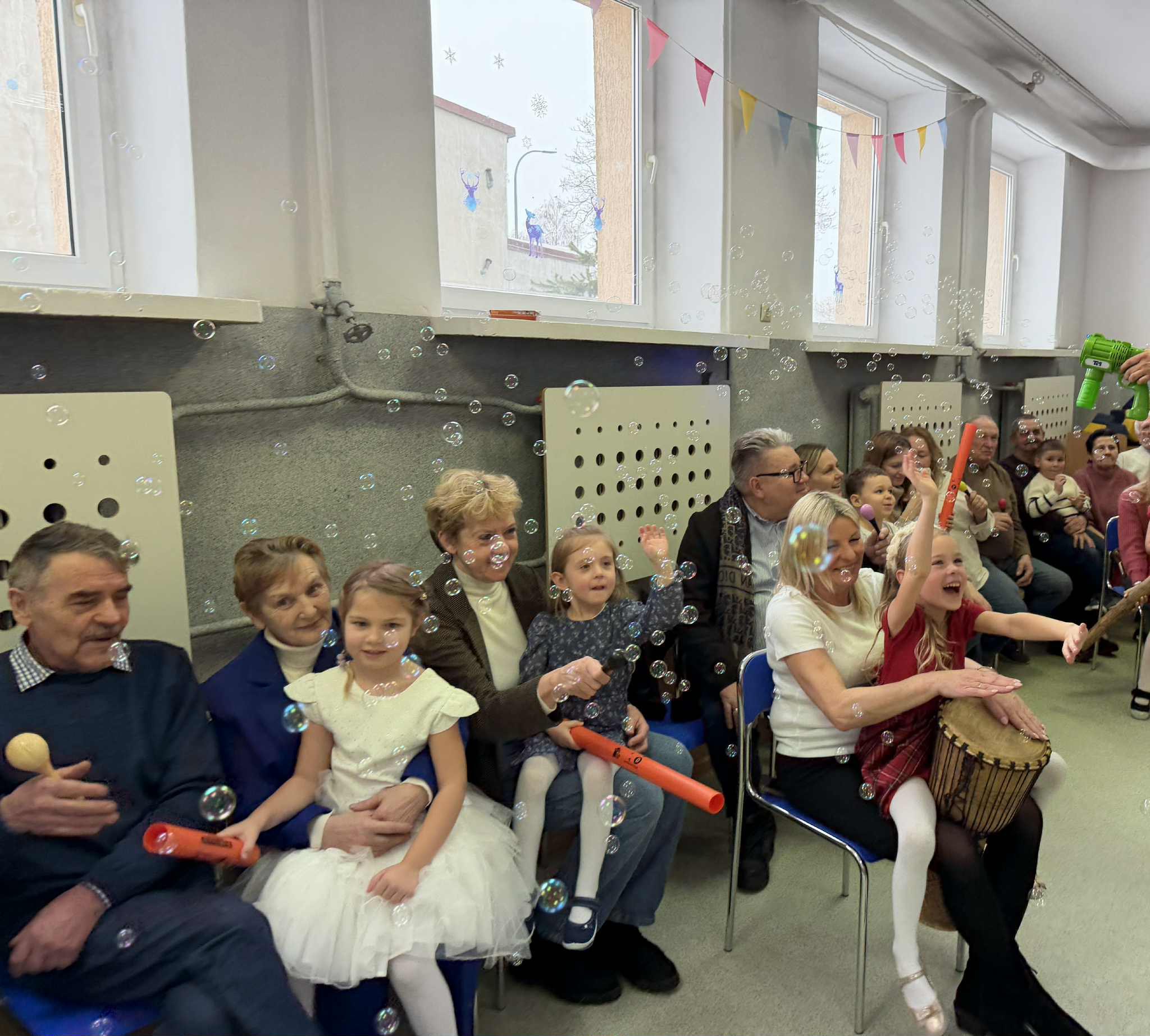 Z okazji Dnia Babci i Dziadka w naszym przedszkolu, odbyły się wyjątkowe warsztaty muzyczne pt: „Muzyka łączy pokolenia”, których celem było wspólne świętowanie oraz integracja międzypokoleniowa. Babcie i Dziadkowie przybyli licznie, aby w radosnej i ciepłej atmosferze spędzić czas ze swoimi wnukami. Nasi wyjątkowi goście, zostali zaproszeni do udziału w warsztatach muzycznych, podczas których wspólnie odkrywali radość płynącą z muzykowania. Wspólne zabawy rytmiczne, śpiew oraz tworzenie prostych akompaniamentów sprzyjały budowaniu więzi, rozwijaniu wrażliwości muzycznej oraz wzajemnemu zrozumieniu i współpracy między pokoleniami. To wyjątkowe spotkanie przebiegło w niezwykle serdecznej i rodzinnej atmosferze, pełnej wzruszeń i pozytywnych emocji. Następnie Babcie i Dziadkowie udali się do sal przedszkolnych na krótki program artystyczny, przygotowany przez dzieci. Mali artyści z wielkim zaangażowaniem śpiewali piosenki, recytowali wierszyki oraz wręczyli piękne, przygotowane własnoręcznie laurki. Serdecznie dziękujemy Rodzicom za zaangażowanie i współpracę oraz Panu Kamilowi Fałdowskiemu z „Moozomontowni” za przeprowadzenie warsztatów.