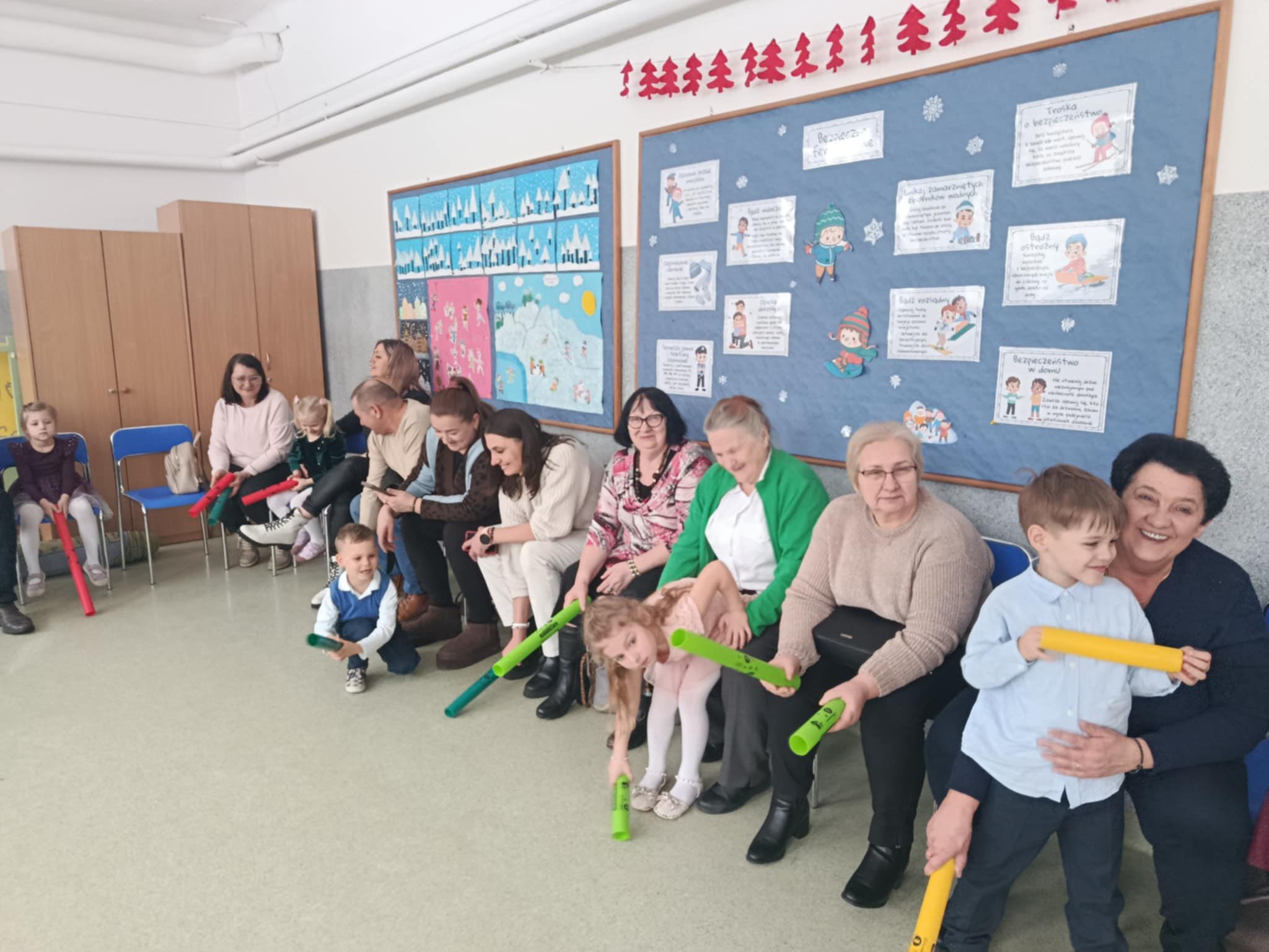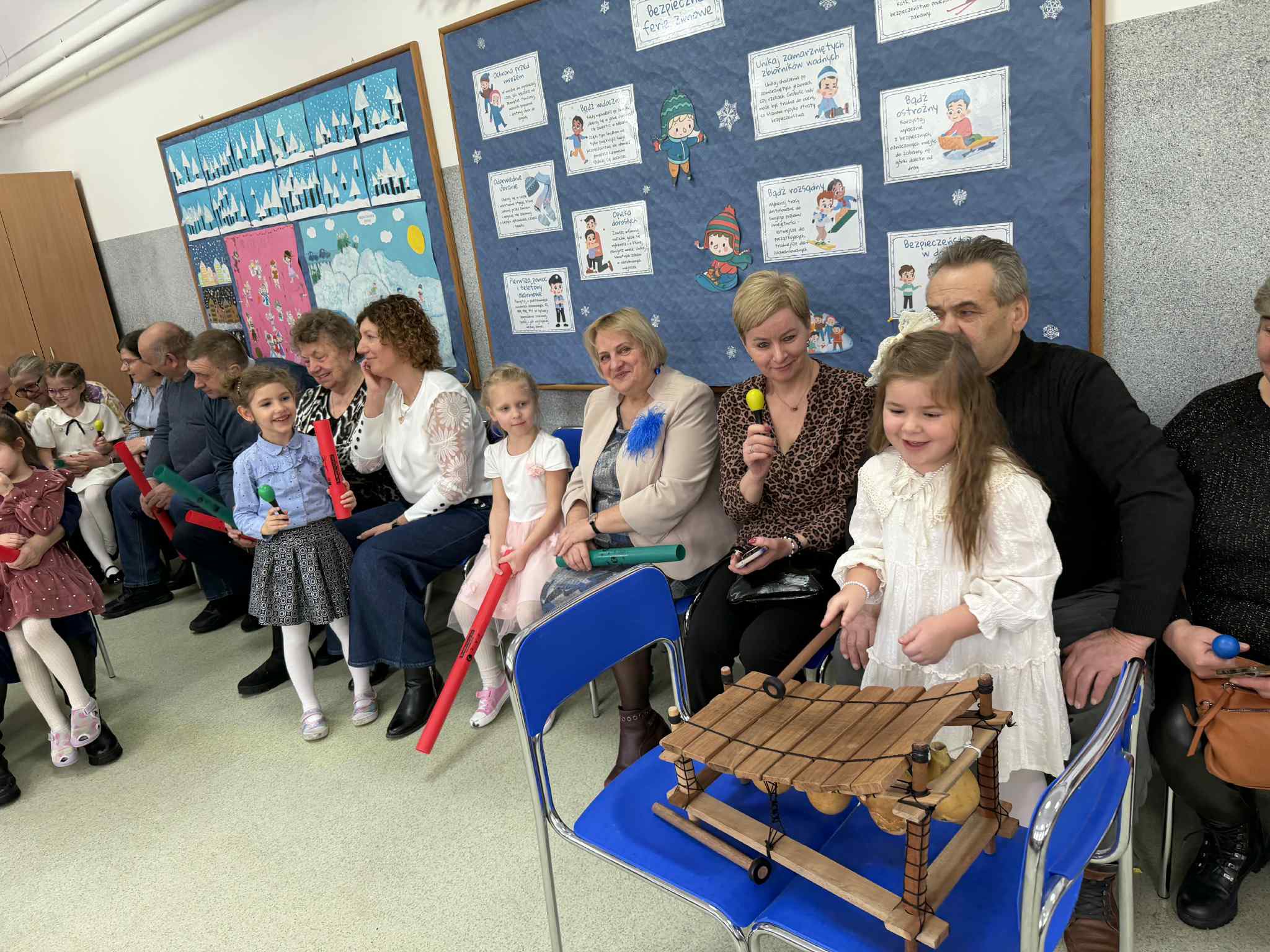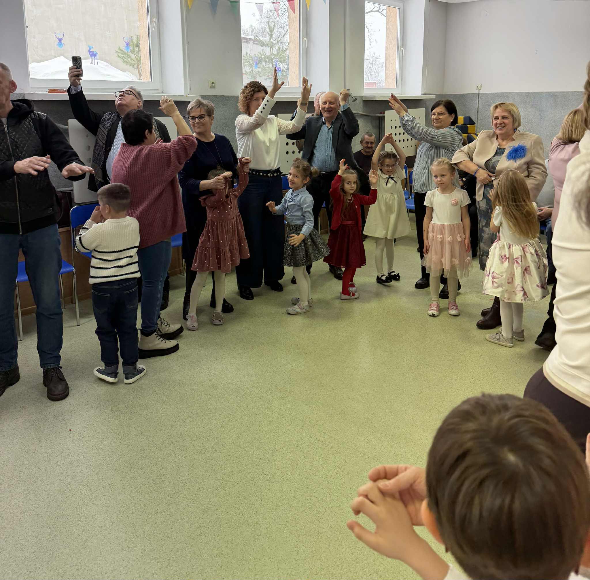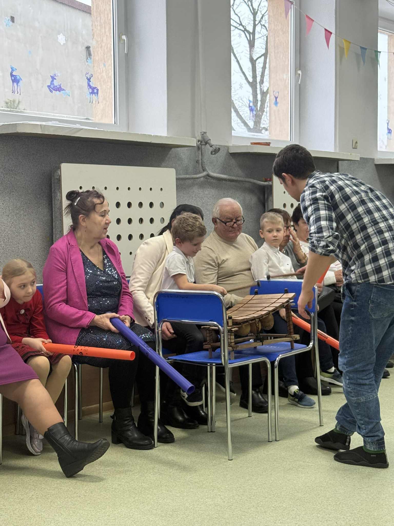 Z okazji Dnia Babci i Dziadka w naszym przedszkolu, odbyły się wyjątkowe warsztaty muzyczne pt: „Muzyka łączy pokolenia”, których celem było wspólne świętowanie oraz integracja międzypokoleniowa. Babcie i Dziadkowie przybyli licznie, aby w radosnej i ciepłej atmosferze spędzić czas ze swoimi wnukami. Nasi wyjątkowi goście, zostali zaproszeni do udziału w warsztatach muzycznych, podczas których wspólnie odkrywali radość płynącą z muzykowania. Wspólne zabawy rytmiczne, śpiew oraz tworzenie prostych akompaniamentów sprzyjały budowaniu więzi, rozwijaniu wrażliwości muzycznej oraz wzajemnemu zrozumieniu i współpracy między pokoleniami. To wyjątkowe spotkanie przebiegło w niezwykle serdecznej i rodzinnej atmosferze, pełnej wzruszeń i pozytywnych emocji. Następnie Babcie i Dziadkowie udali się do sal przedszkolnych na krótki program artystyczny, przygotowany przez dzieci. Mali artyści z wielkim zaangażowaniem śpiewali piosenki, recytowali wierszyki oraz wręczyli piękne, przygotowane własnoręcznie laurki. Serdecznie dziękujemy Rodzicom za zaangażowanie i współpracę oraz Panu Kamilowi Fałdowskiemu z „Moozomontowni” za przeprowadzenie warsztatów.