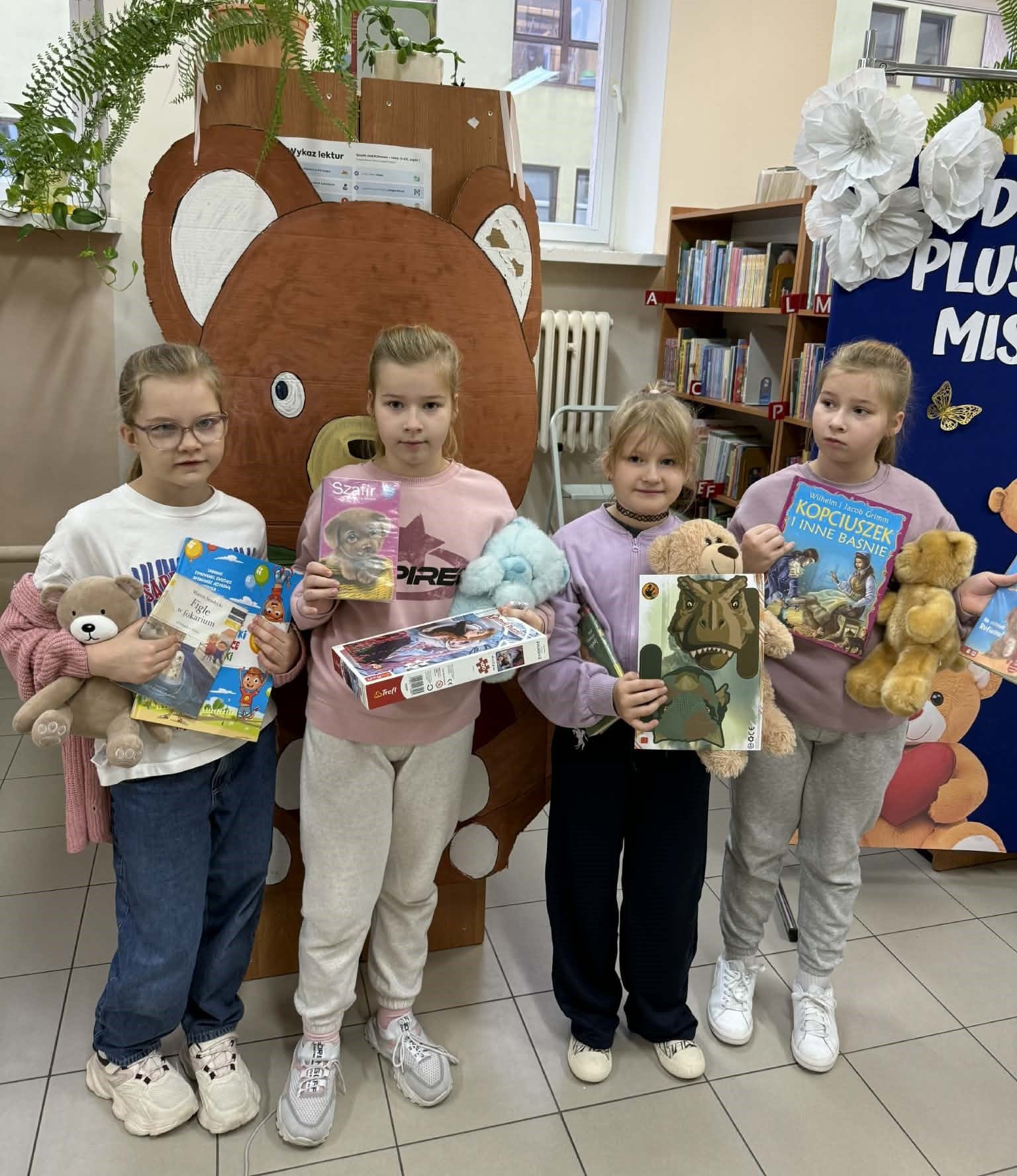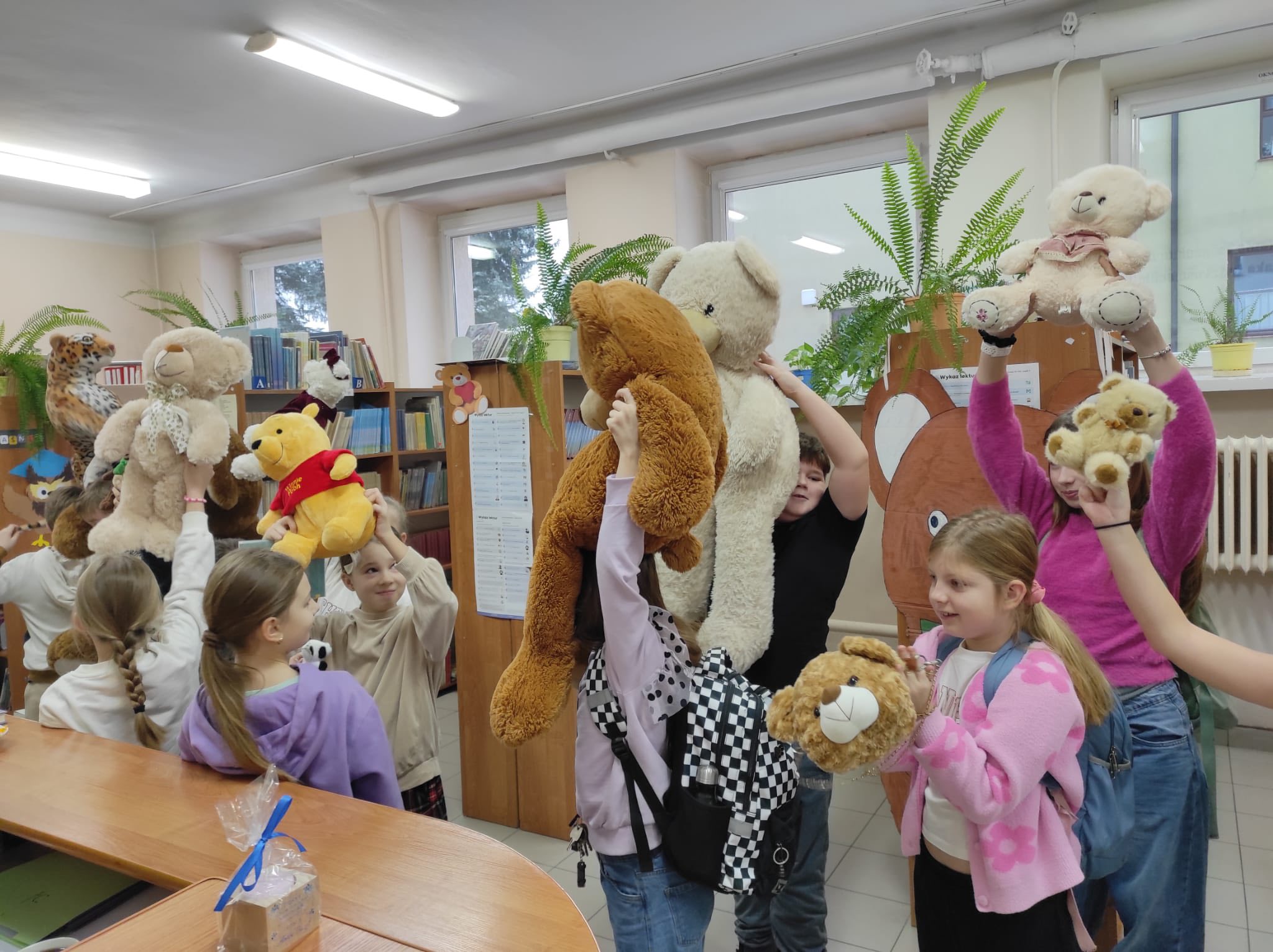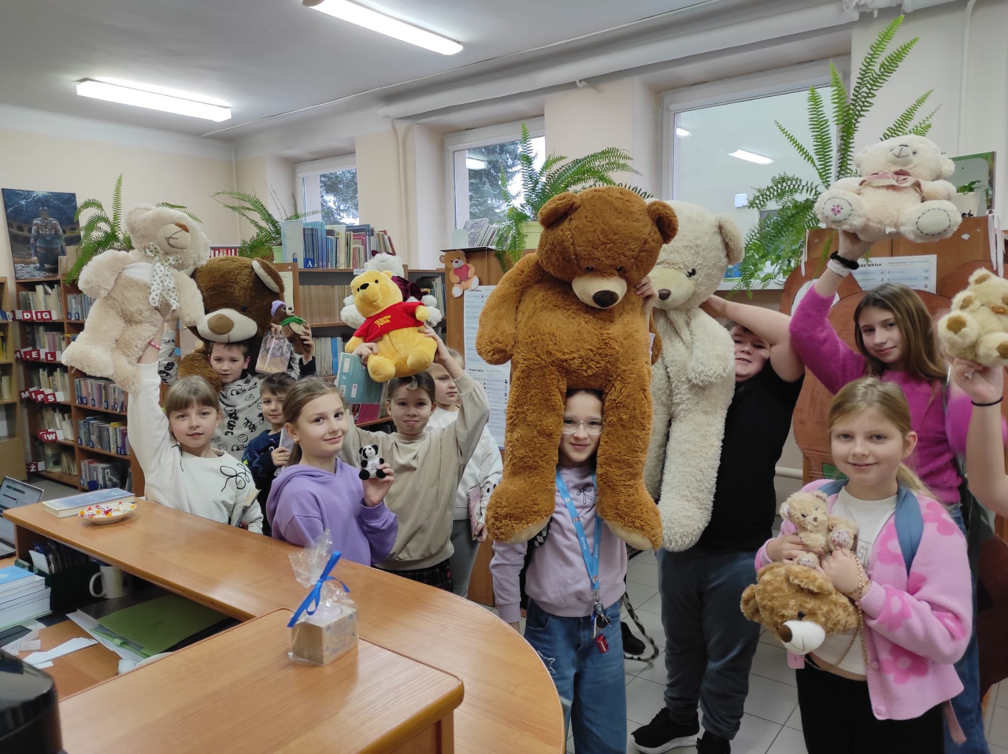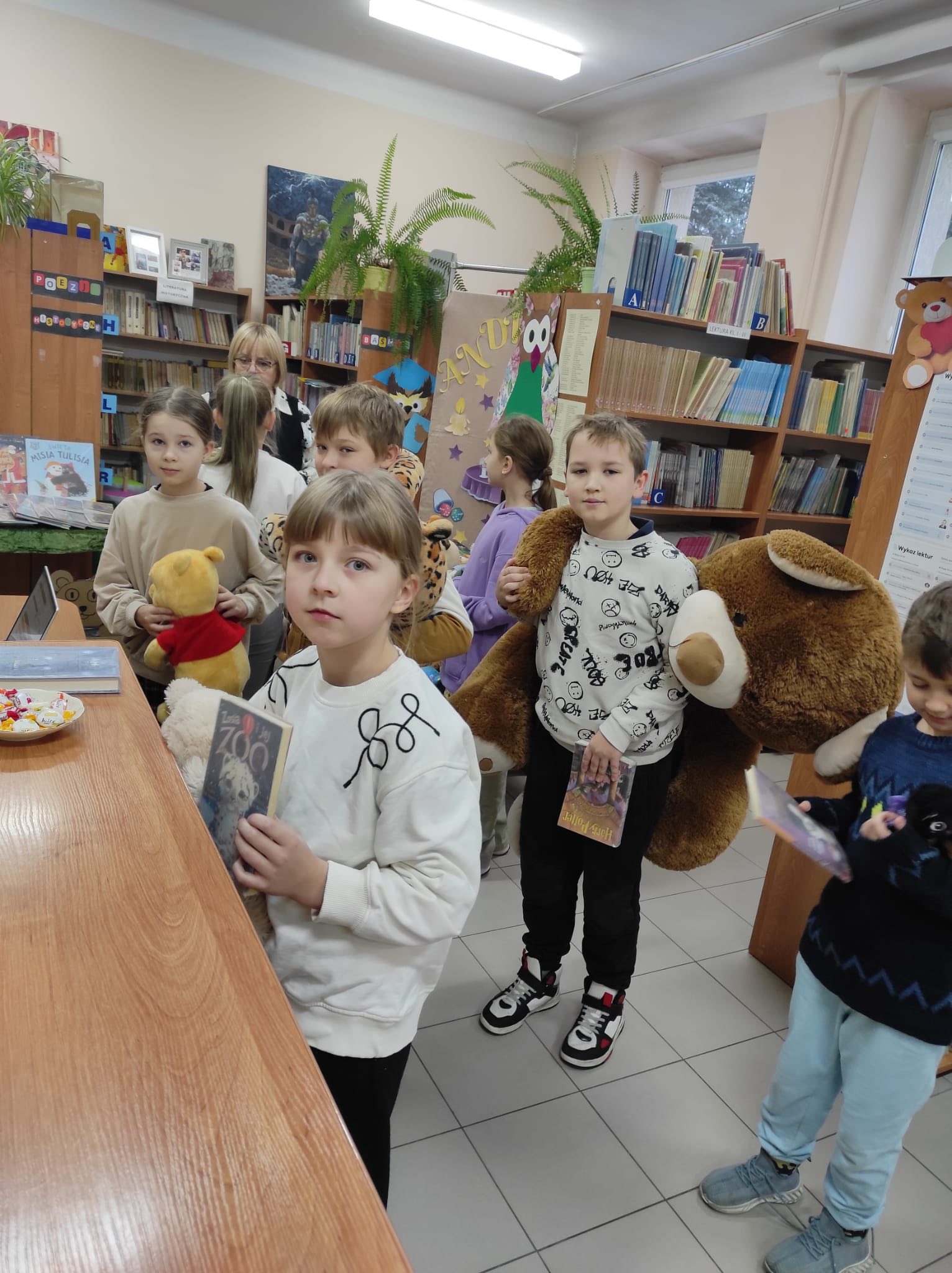 „Taki dzień się zdarza raz…” – jak mówią słowa znanej piosenki, a 25 listopada w naszej szkolnej bibliotece mogliśmy poczuć wyjątkową magię tego dnia. Z okazji Dnia Pluszowego Misia bibliotekę odwiedziło wielu uczniów, którzy z radością prezentowali swoje ukochane misie. Wielu uczniów wybierało książki do wypożyczenia, a pluszaki z uśmiechem „pomagały” w odnajdywaniu najciekawszych tytułów. W bibliotece panowała ciepła, radosna atmosfera, pełna śmiechu i serdeczności. Najmłodsi pokazywali swoje ulubione misie, które dodały temu dniu wyjątkowego uroku. Wszyscy, którzy przyszli z misiem i wypożyczyli książkę, otrzymali upominki-niespodzianki. To był dzień pełen uśmiechów, zabawy i miłych chwil – a biblioteka stała się na moment najbardziej przytulnym miejscem w szkole.