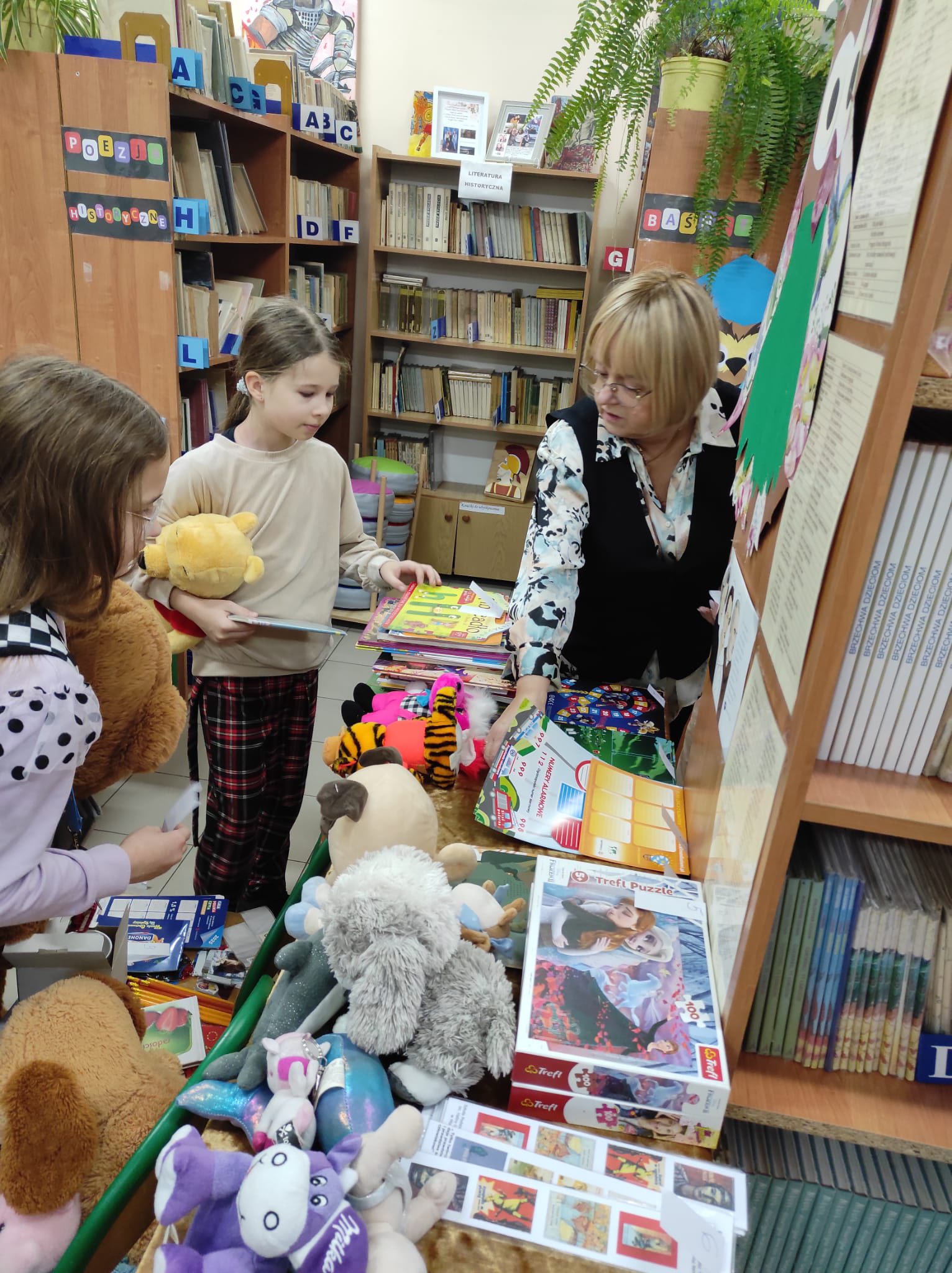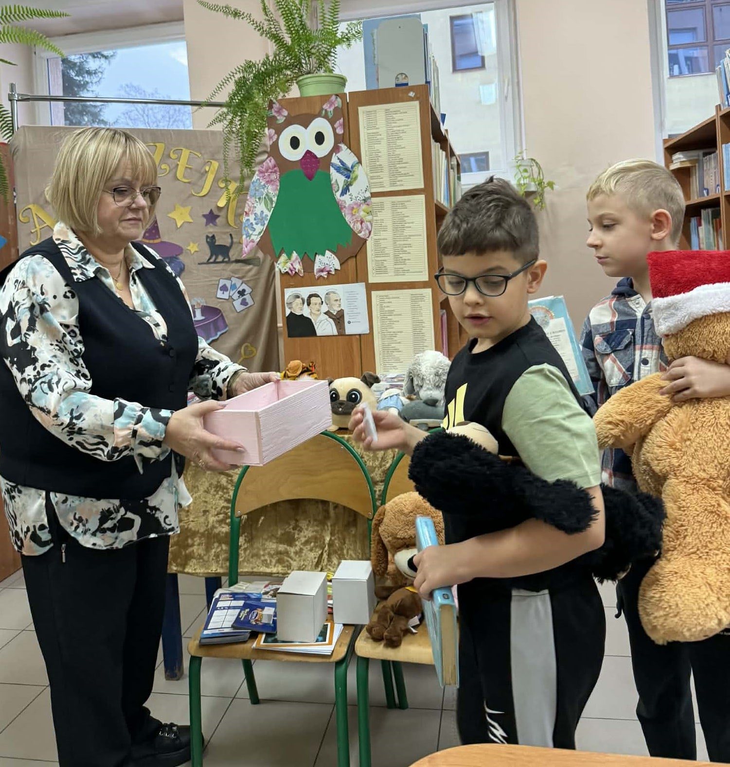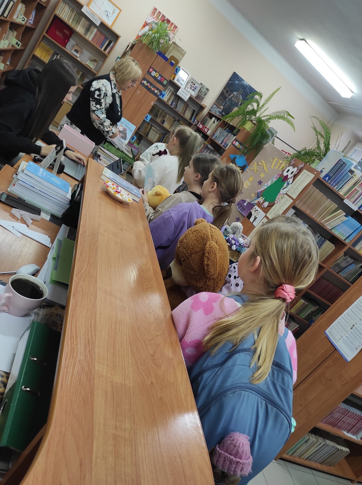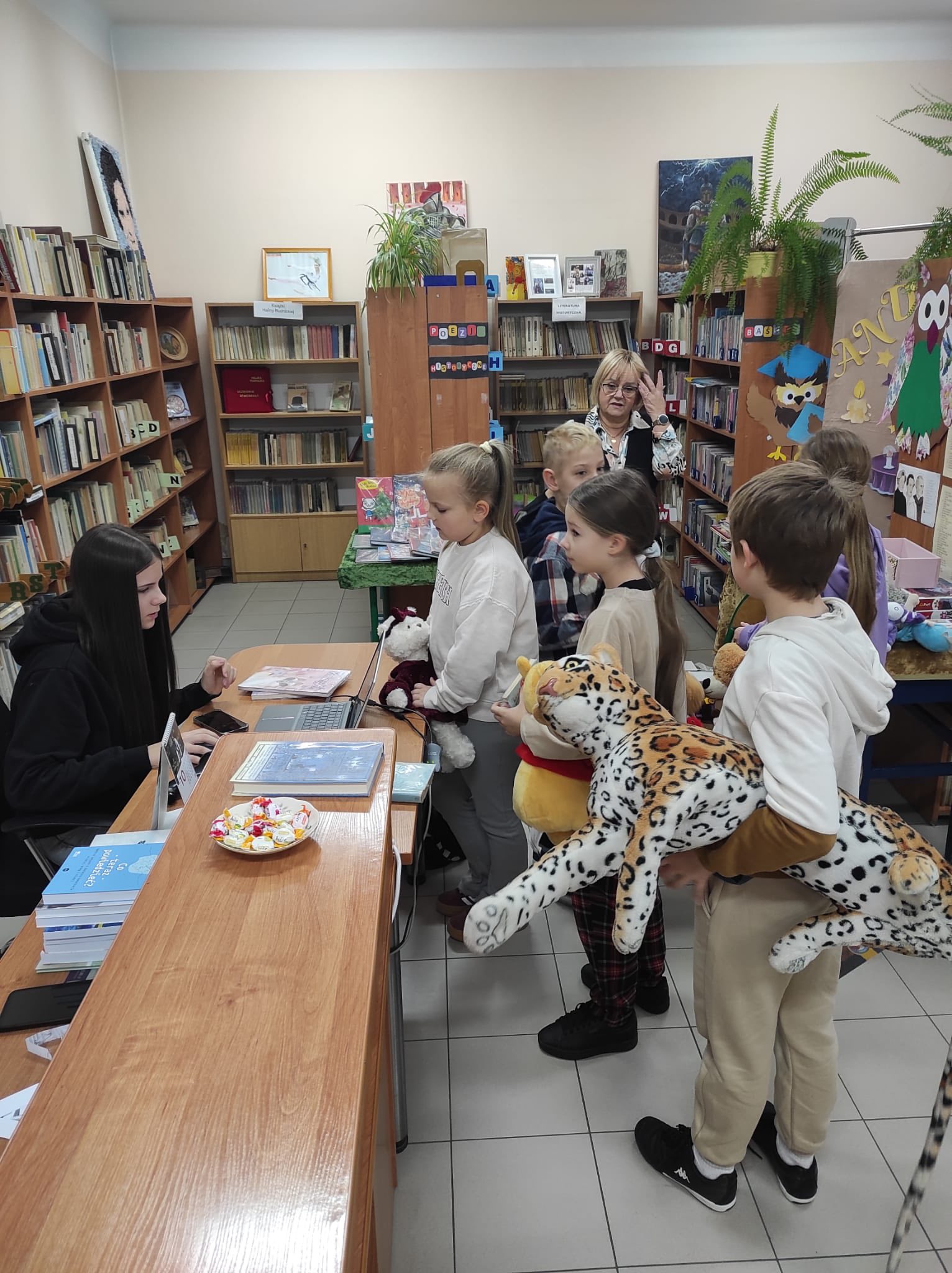 „Taki dzień się zdarza raz…” – jak mówią słowa znanej piosenki, a 25 listopada w naszej szkolnej bibliotece mogliśmy poczuć wyjątkową magię tego dnia. Z okazji Dnia Pluszowego Misia bibliotekę odwiedziło wielu uczniów, którzy z radością prezentowali swoje ukochane misie. Wielu uczniów wybierało książki do wypożyczenia, a pluszaki z uśmiechem „pomagały” w odnajdywaniu najciekawszych tytułów. W bibliotece panowała ciepła, radosna atmosfera, pełna śmiechu i serdeczności. Najmłodsi pokazywali swoje ulubione misie, które dodały temu dniu wyjątkowego uroku. Wszyscy, którzy przyszli z misiem i wypożyczyli książkę, otrzymali upominki-niespodzianki. To był dzień pełen uśmiechów, zabawy i miłych chwil – a biblioteka stała się na moment najbardziej przytulnym miejscem w szkole.