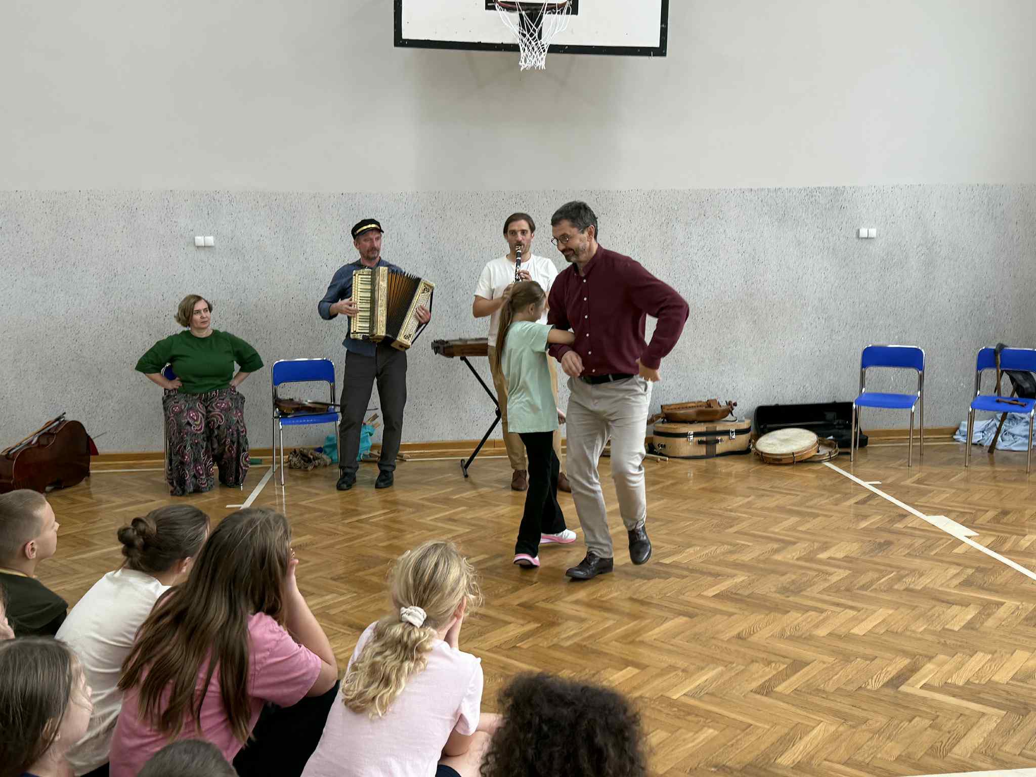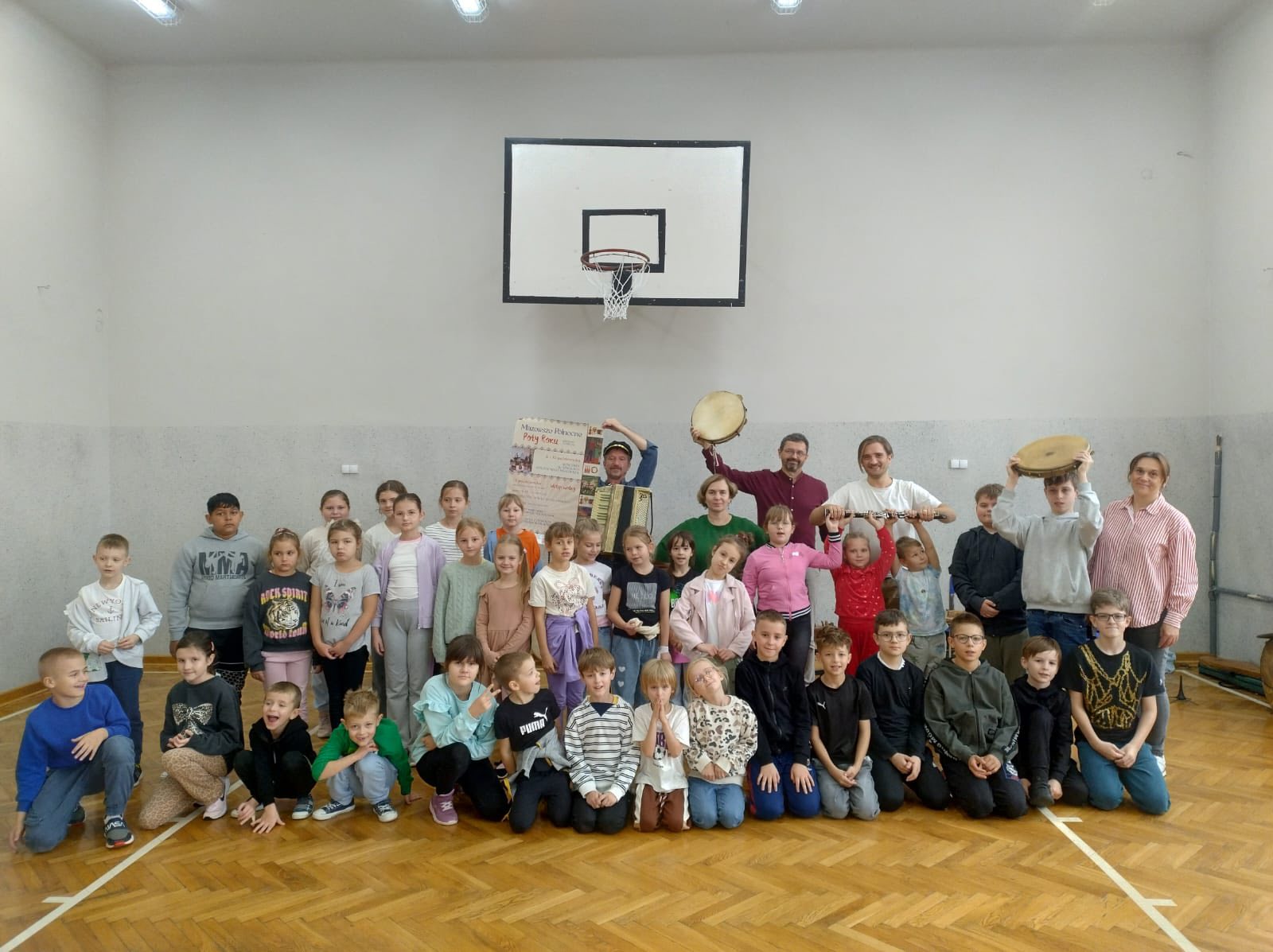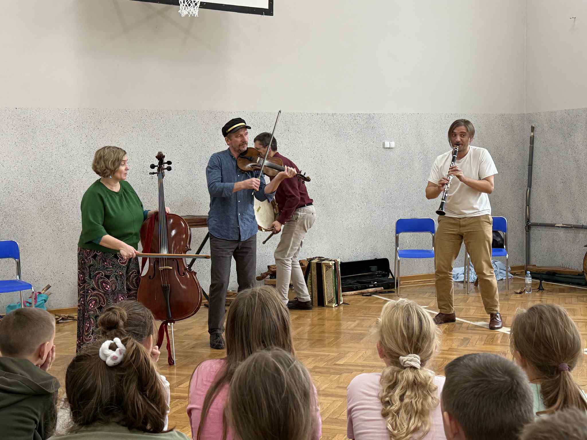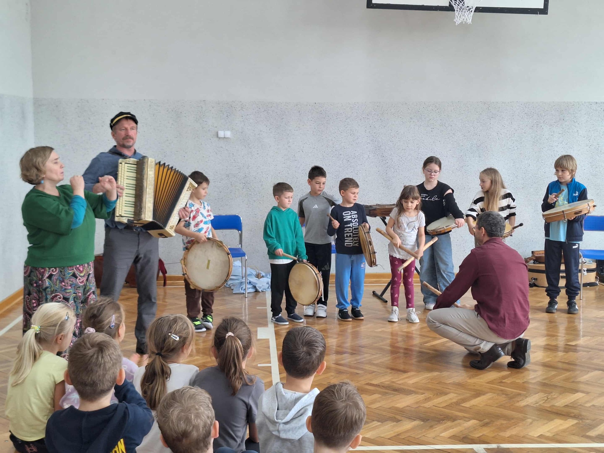Dziś w naszej szkole gościliśmy wspaniałych artystów – Kaję Prusinowską, Janusza Prusinowskiego, Piotra Piszczatowskiego i Patryka Peterssona. To już czwarty rok, gdy przemierzają Mazowsze Północne, niosąc dzieciom i młodzieży tradycyjne pieśni i melodie naszych przodków.