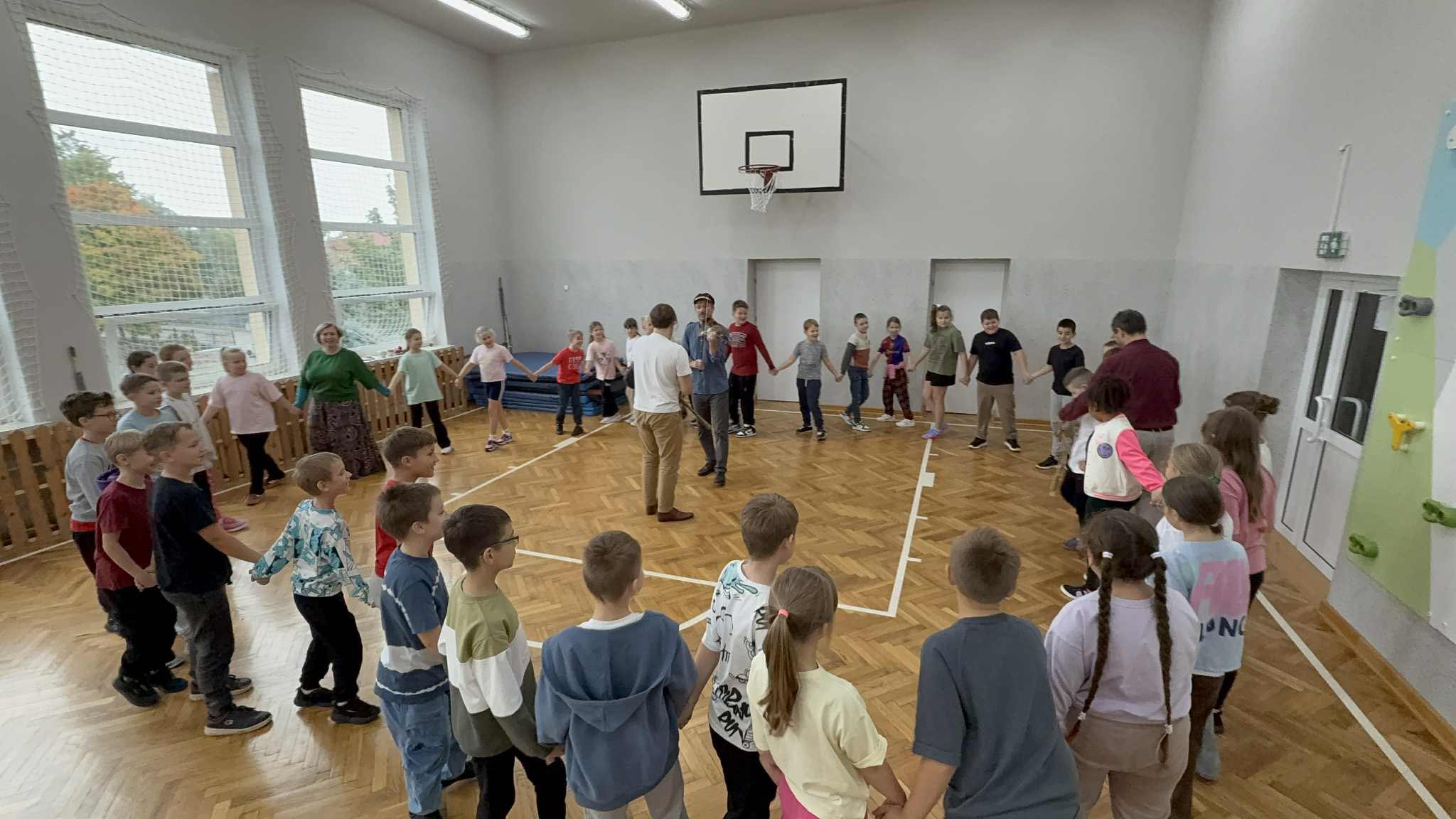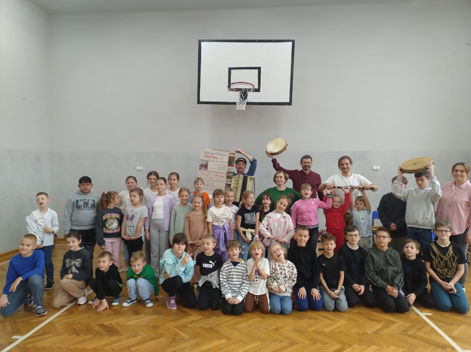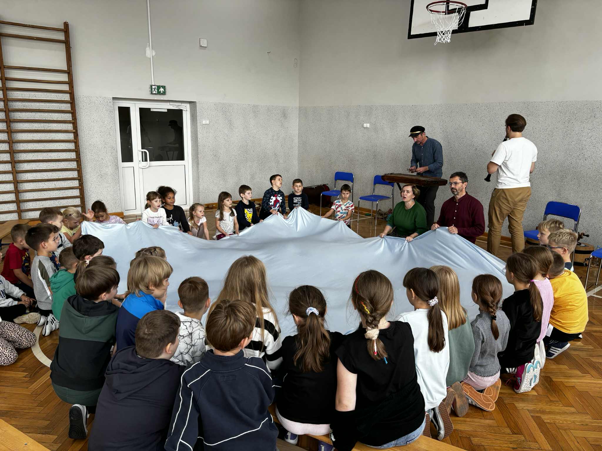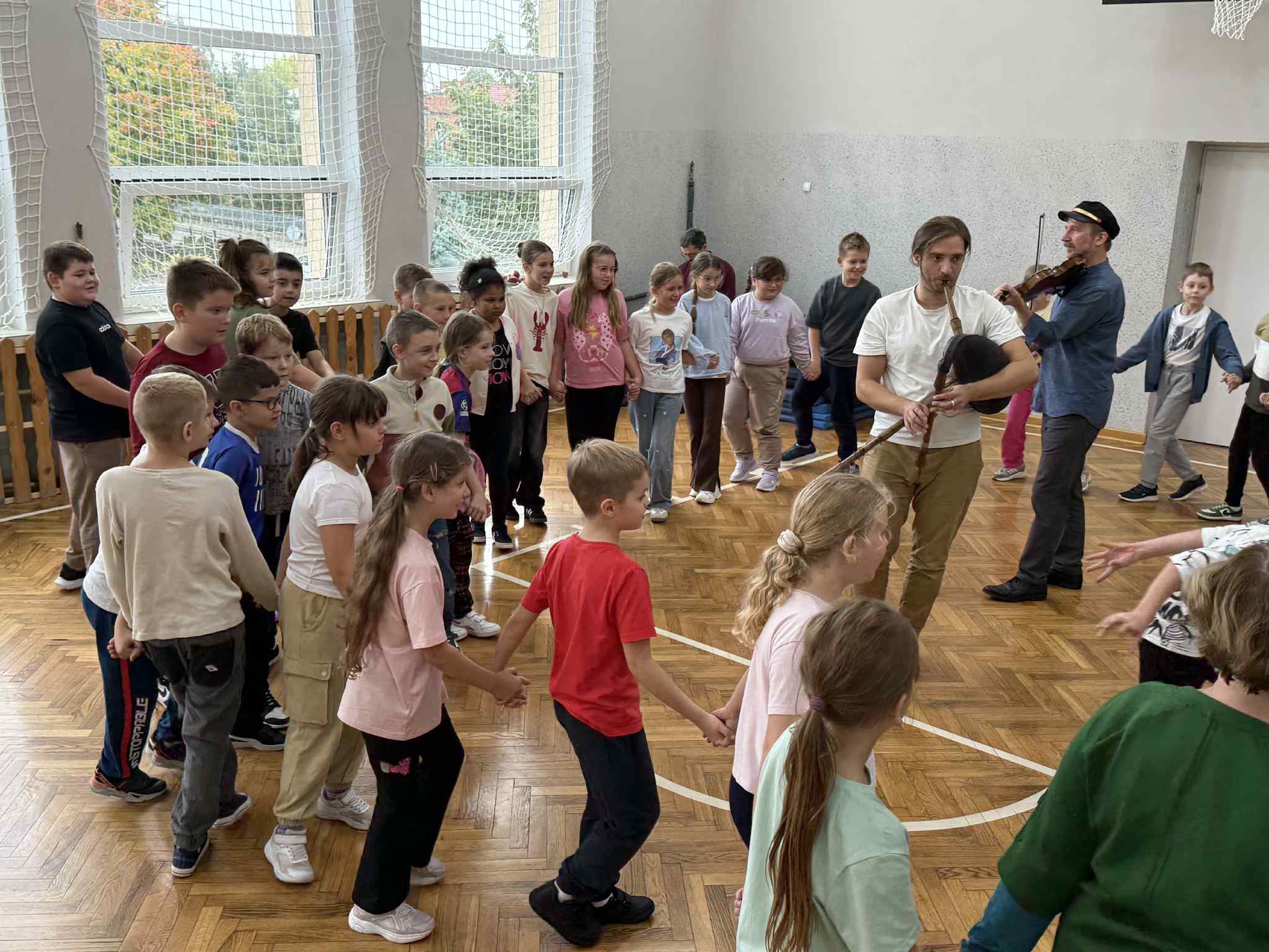 Dziś w naszej szkole gościliśmy wspaniałych artystów – Kaję Prusinowską, Janusza Prusinowskiego, Piotra Piszczatowskiego i Patryka Peterssona. To już czwarty rok, gdy przemierzają Mazowsze Północne, niosąc dzieciom i młodzieży tradycyjne pieśni i melodie naszych przodków.