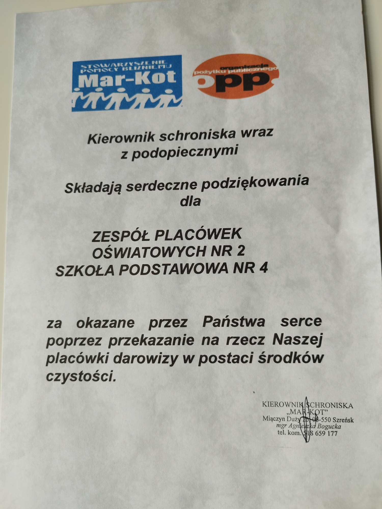 Serdecznie dziękujemy wszystkim uczniom i rodzicom Zespołu Placówek Oświatowych nr 2 w Mławie za zaangażowanie w zbiórkę środków czystości i higieny osobistej dla Stowarzyszenia Pomocy Bliźniemu Mar - Kot.