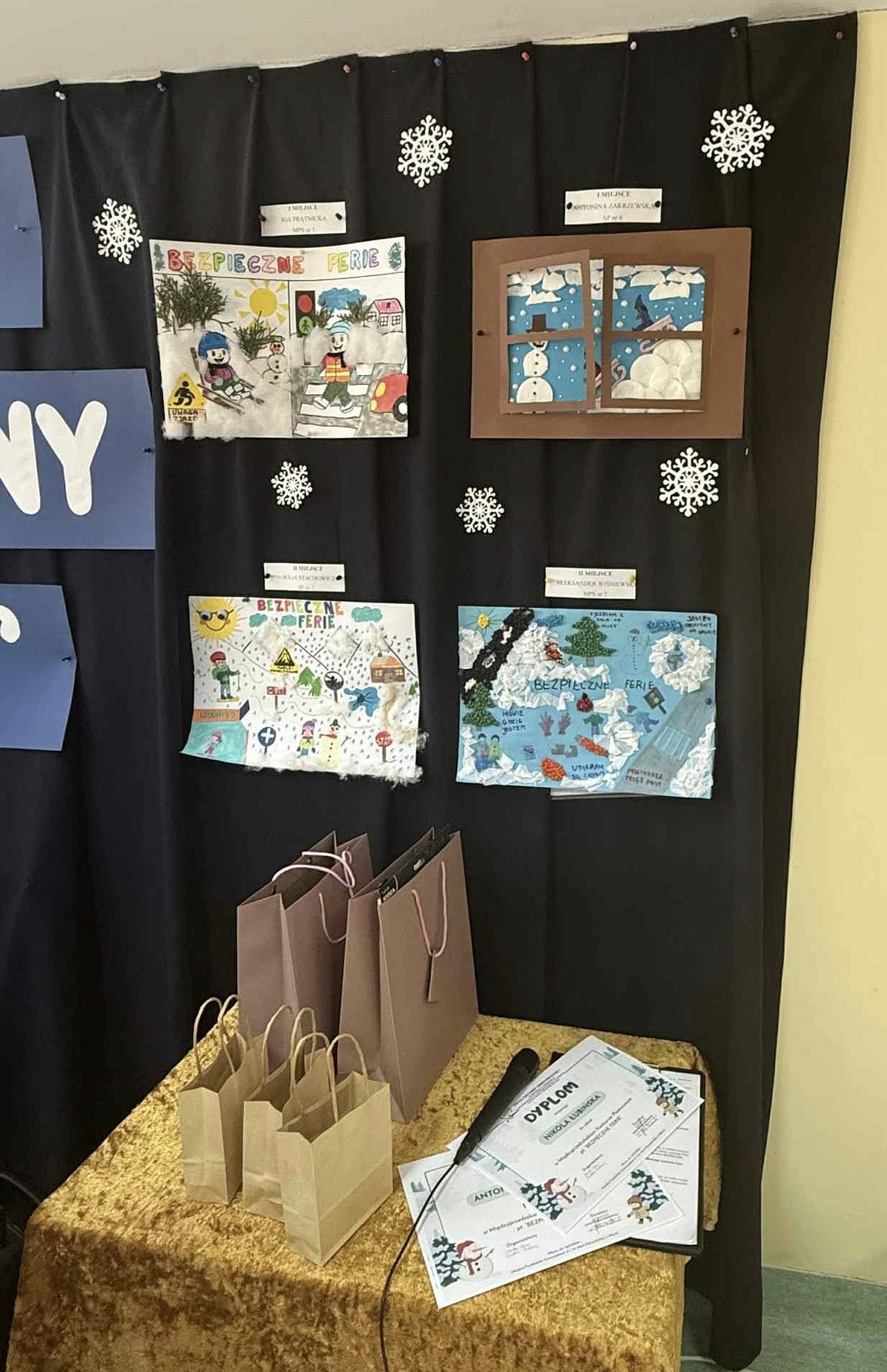 W dniu 16 stycznia 2016 r. odbyło się uroczyste rozstrzygnięcie Międzyprzedszkolnego Konkursu Plastycznego pt: „Bezpieczne ferie”, zorganizowanego przez Zespół Placówek Oświatowych nr 1 w Mławie. Z radością informujemy, że Aleksander Wiśniewski z grupy VII Sówki zdobył II miejsce. Uczestnicy mieli również okazję spotkać się z policjantami, którzy przypomnieli zasady bezpiecznego spędzania ferii zimowych.