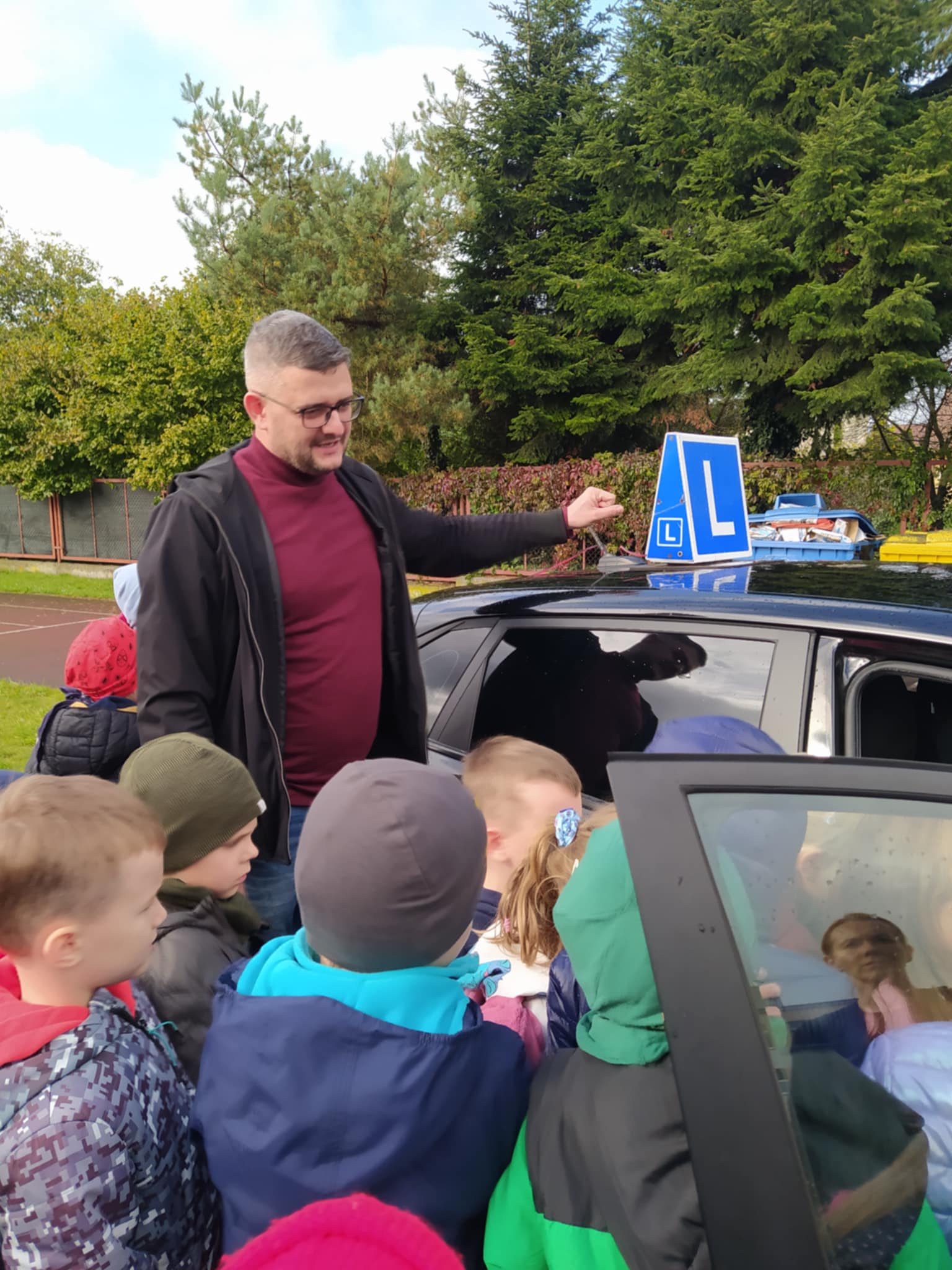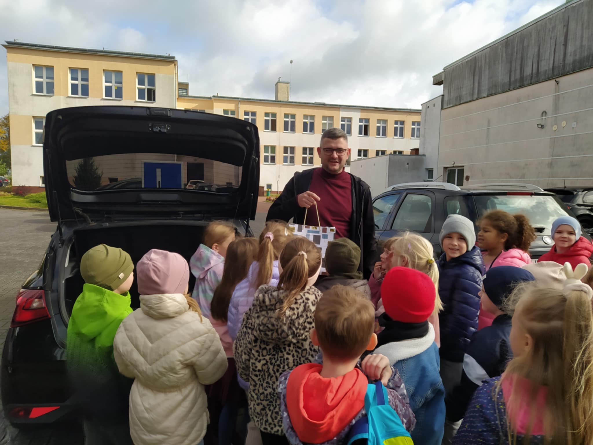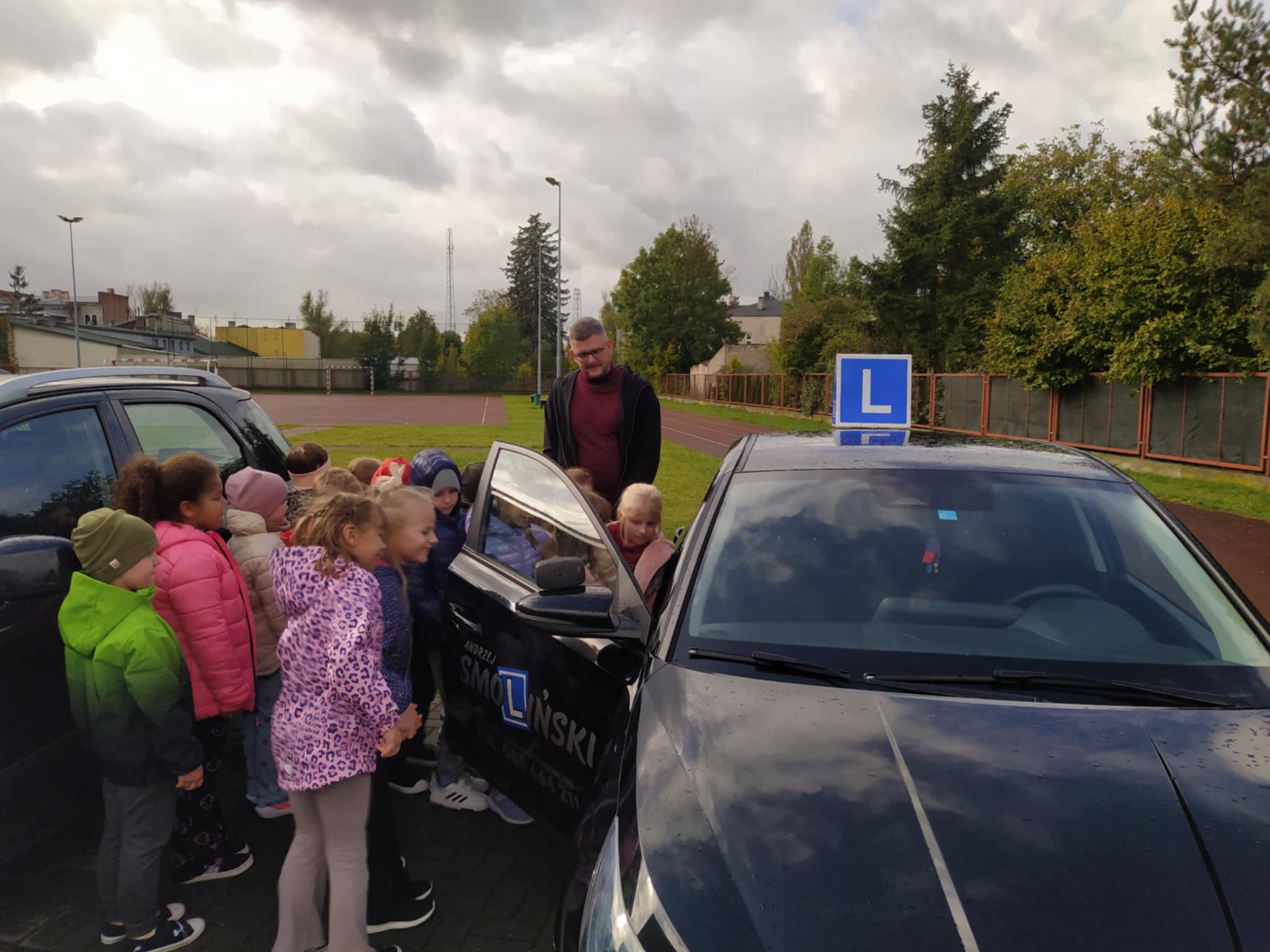 10 października klasę 1b odwiedził jeden z rodziców- Pan Andrzej Smoliński - instruktor nauki jazdy, który opowiedział o swojej pracy i zasadach bezpiecznego poruszania się po drogach. Dzieci dowiedziały się, jak ważna jest znajomość przepisów ruchu drogowego i odpowiedzialność kierowcy. Wszyscy uczniowie mogli obejrzeć z bliska samochód, w którym odbywa się nauka jazdy. Po rozwiązaniu wielu zagadek, w bagażniku dla dzieci czekała niespodzianka. Spotkanie było ciekawe i zachęcało uczniów do myślenia o przyszłych zawodach.