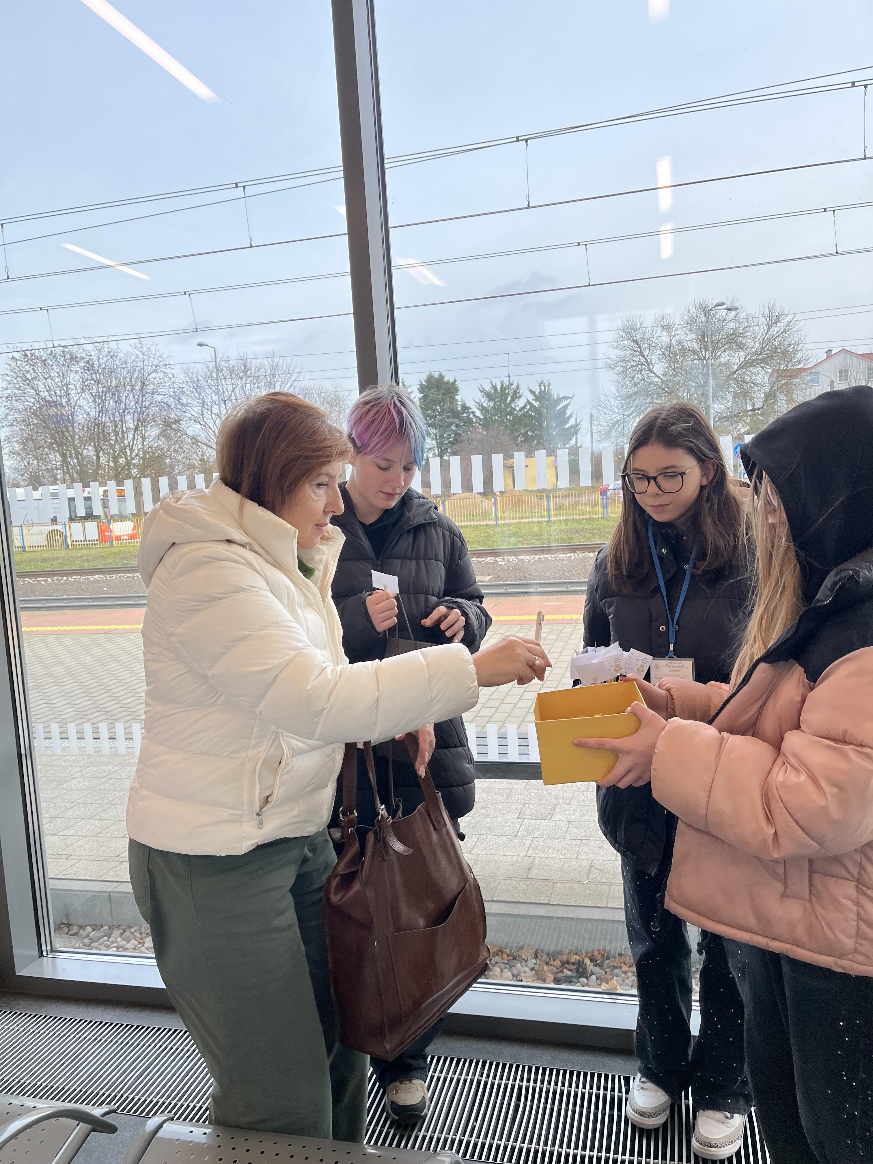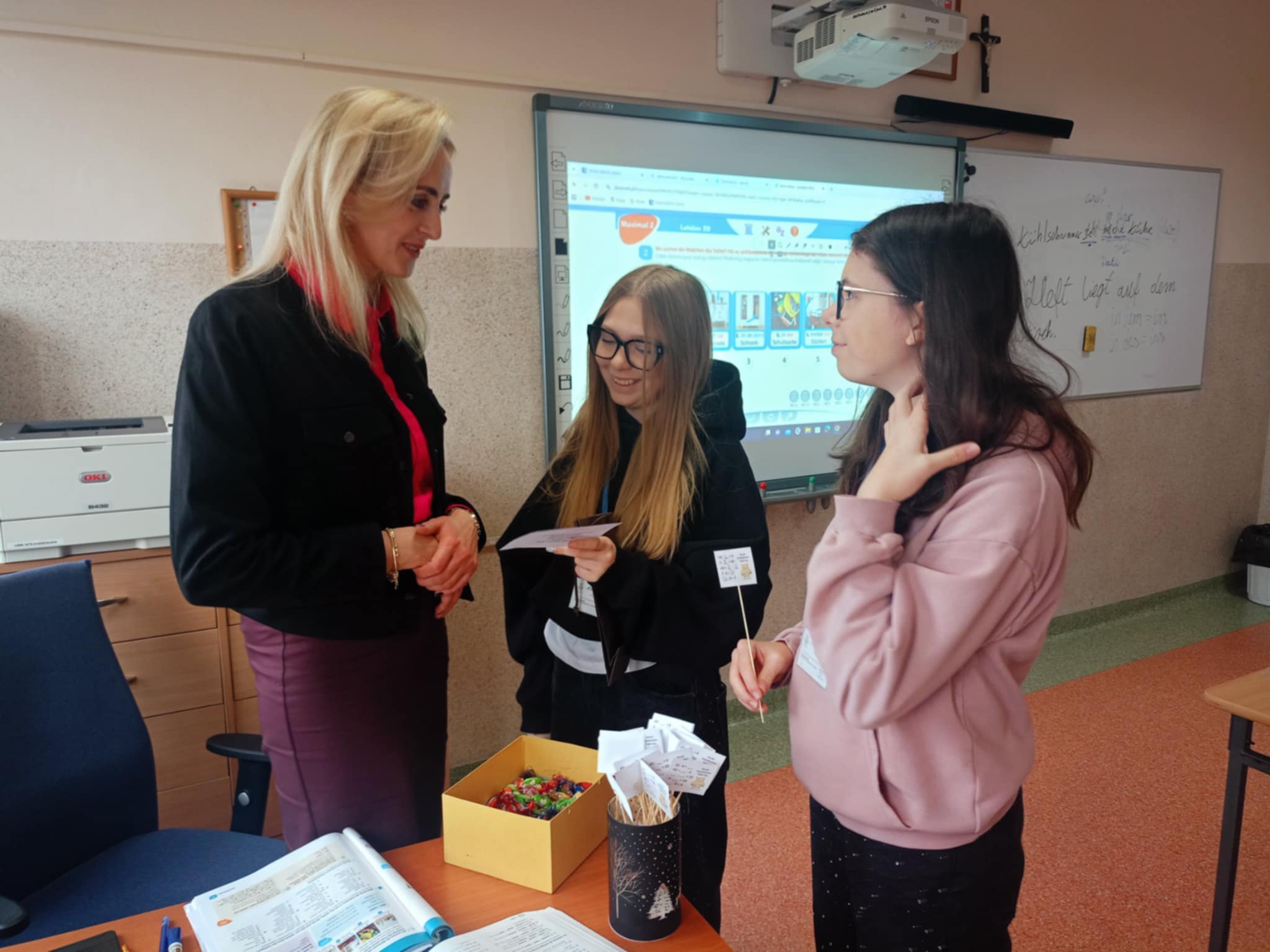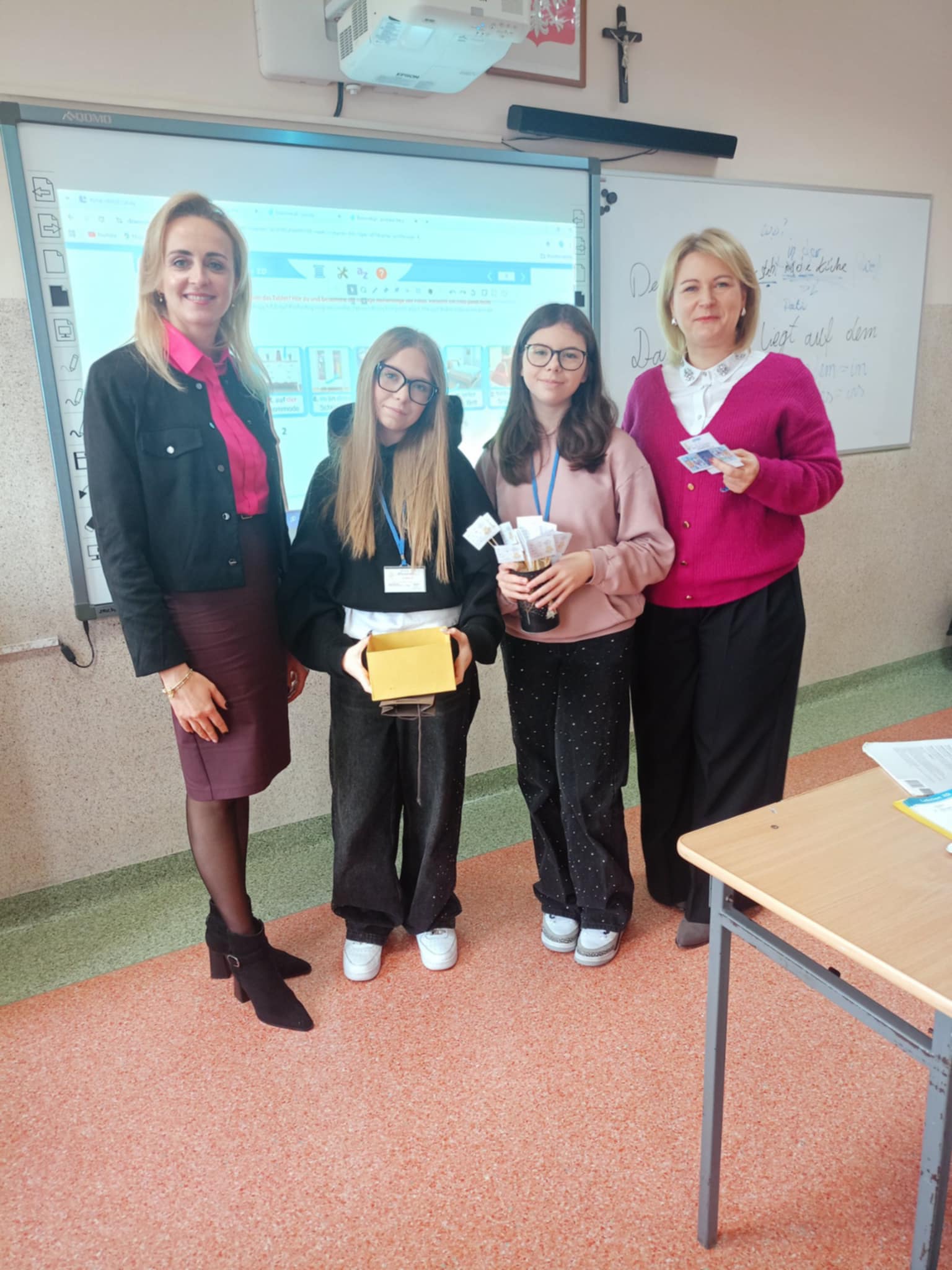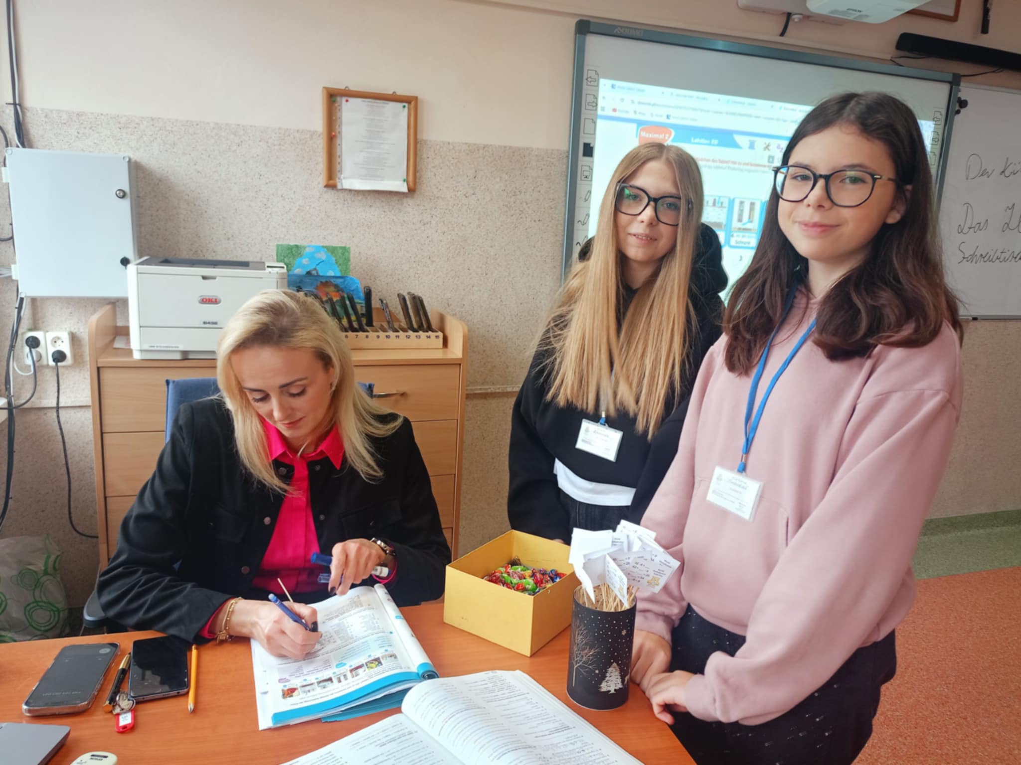 Dodatkowo grupa uczniów–egzaminatorów wyruszyła poza teren szkoły, aby włączyć do zabawy lokalną społeczność. Przechodnie podejmowali wyzwanie, a atmosfera wspólnej zabawy sprawiła, że matematyka na chwilę zagościła także na ulicach naszej dzielnicy.