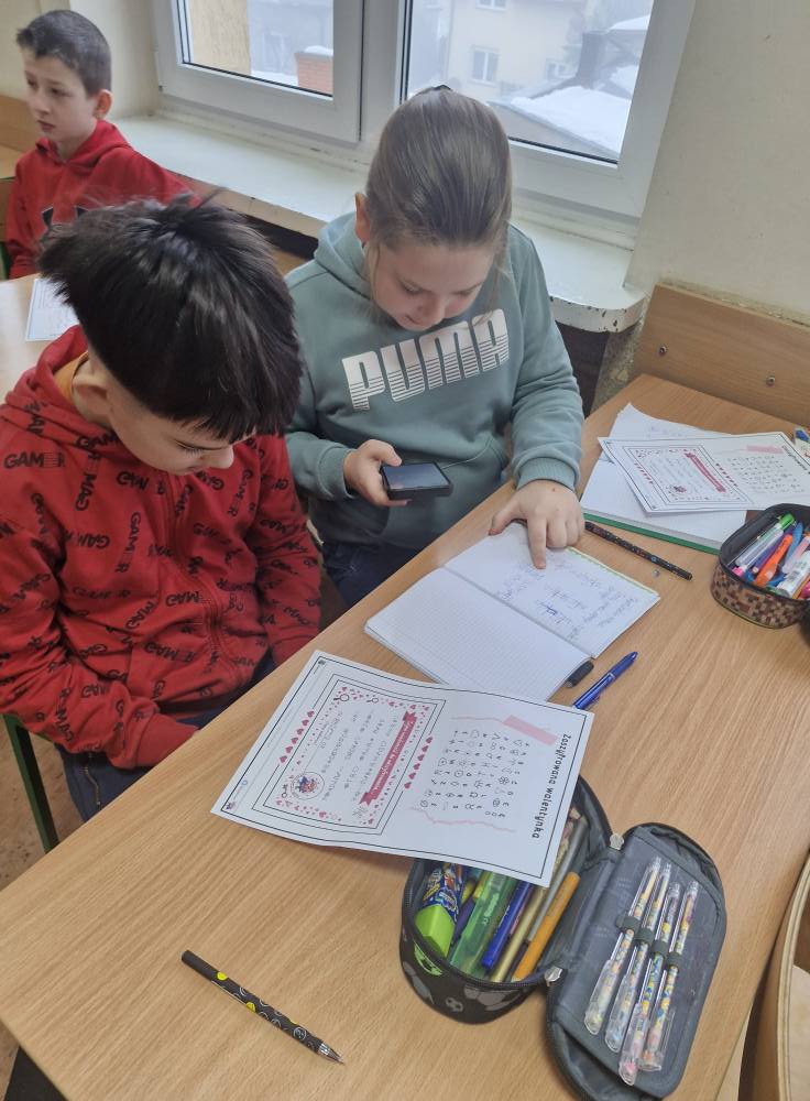 Dnia 13 lutego 2026r. na lekcji matematyki w klasach 4a oraz 6a uczniowie wzięli udział w Walentynkowej Sztafecie Zadaniowej. Zamiast tradycyjnych ćwiczeń czekały na nich matematyczne wyzwania ukryte w zagadkach.