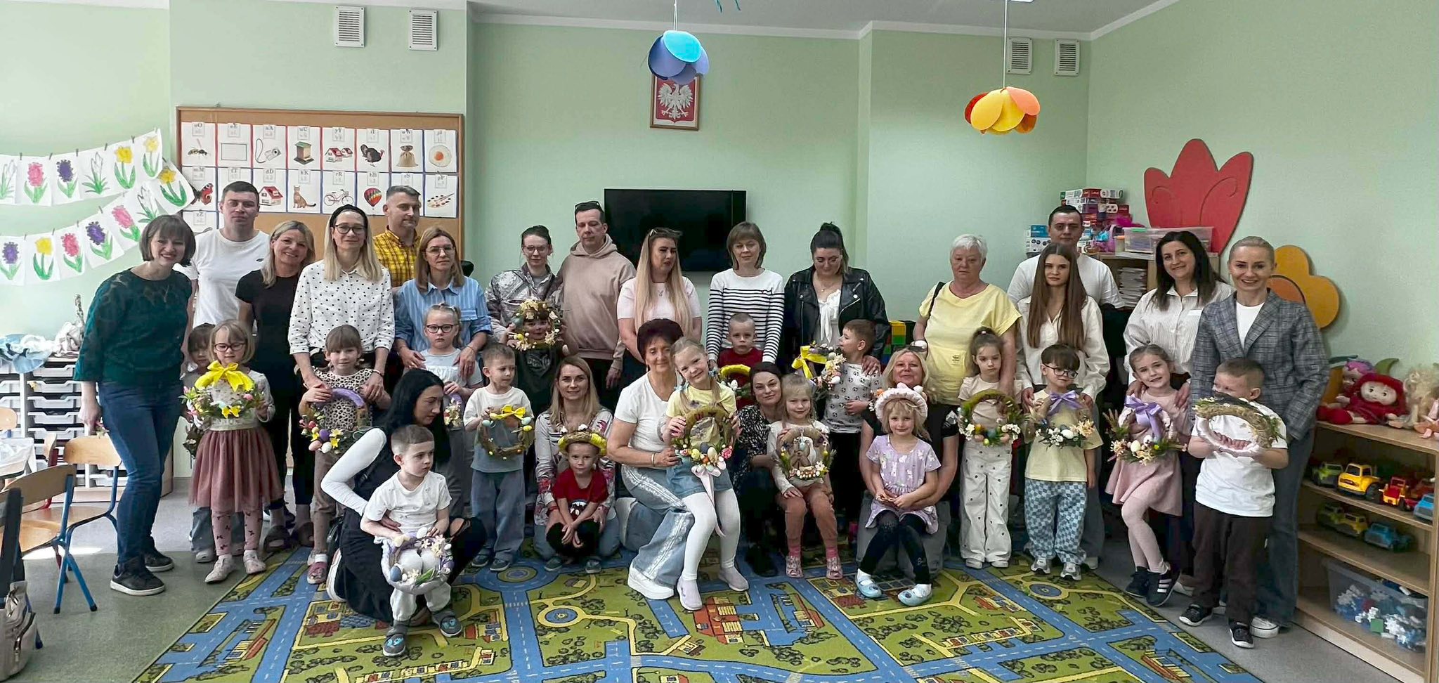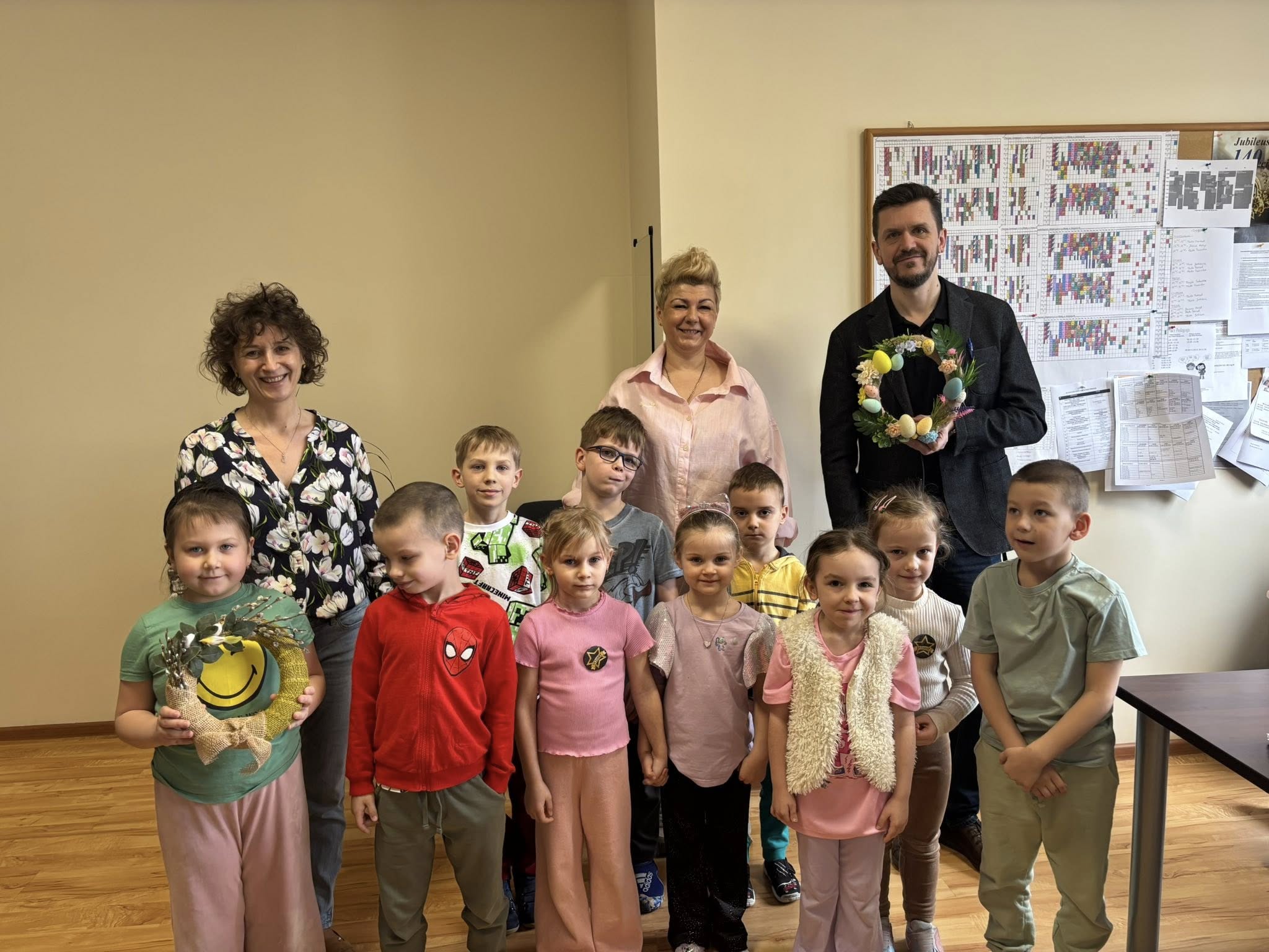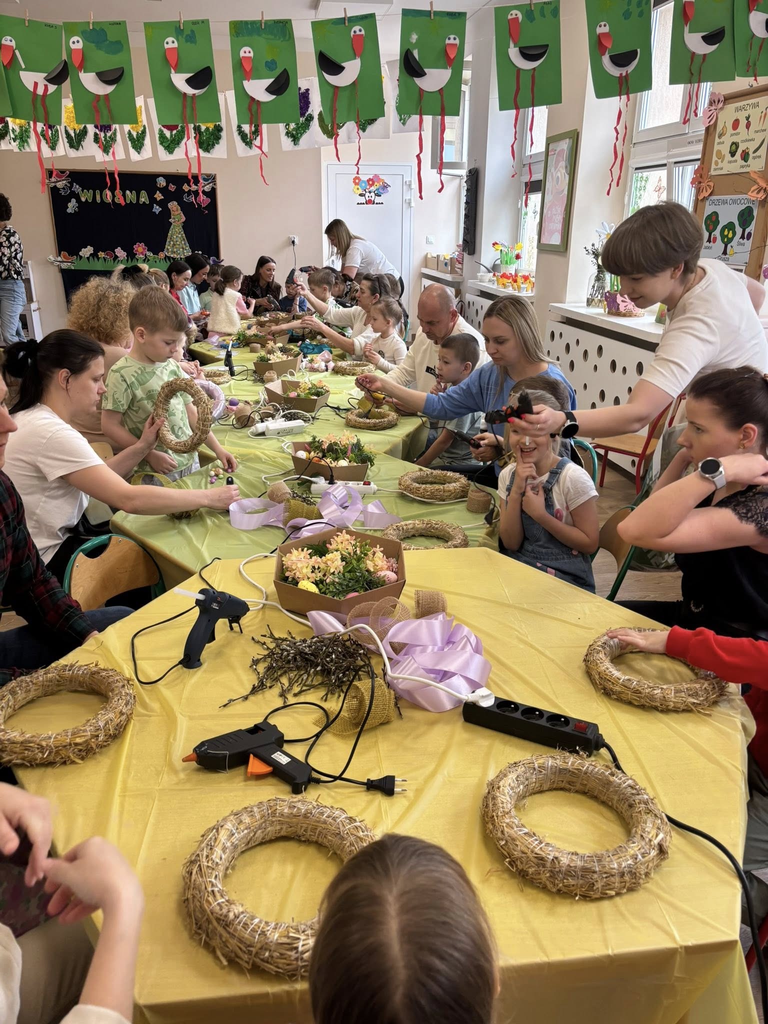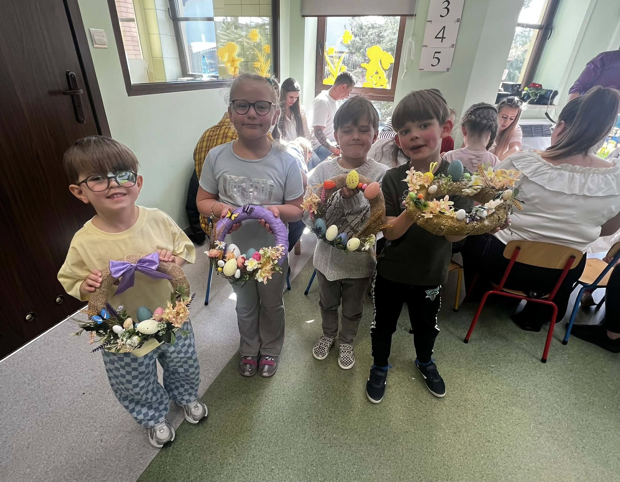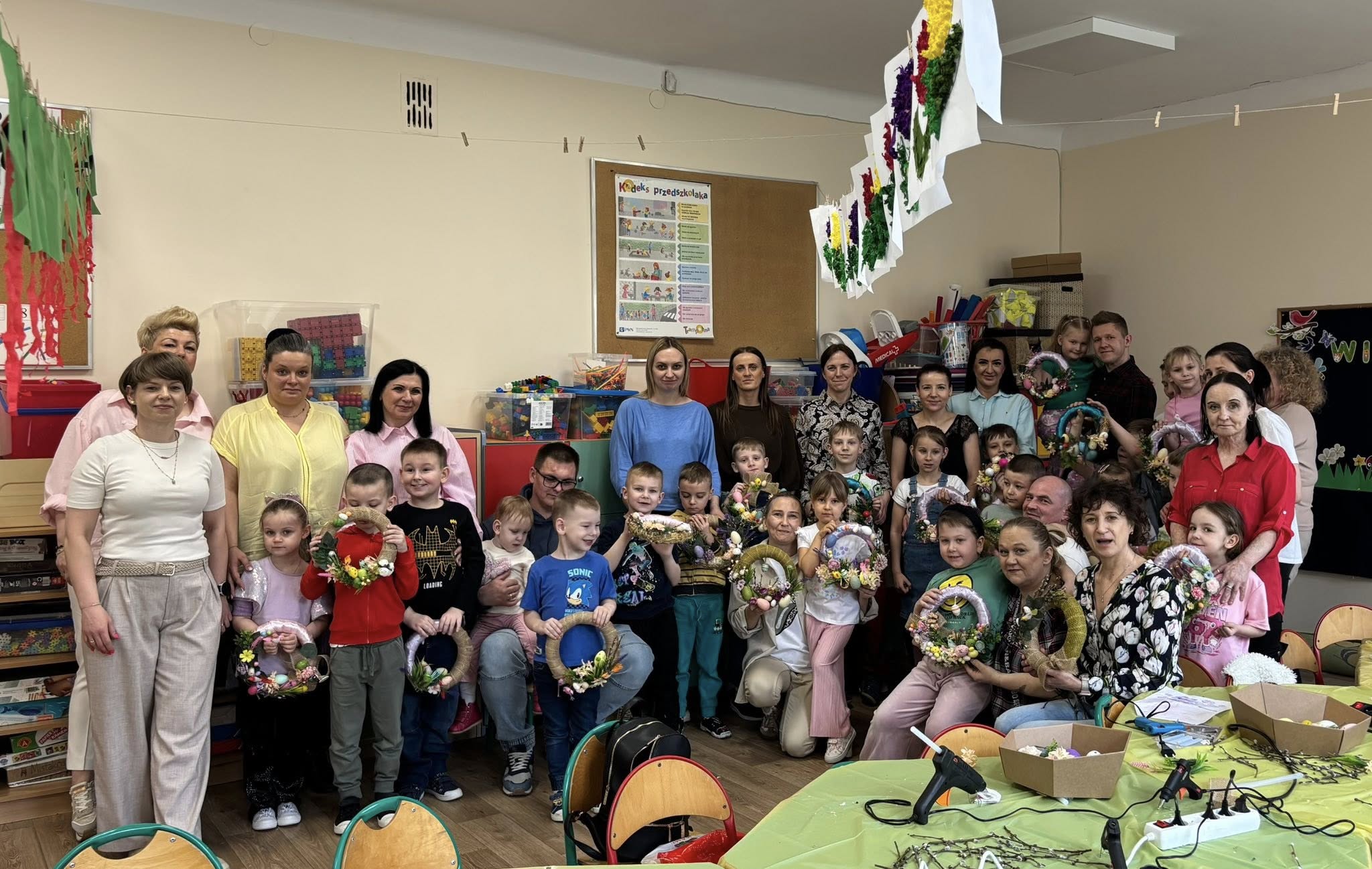 W naszym przedszkolu odbyły się warsztaty wielkanocne z udziałem rodziców, co stworzyło miłą i integracyjną atmosferę. Dzieci wspólnie z rodzicami wykonywały wielkanocne wianki, ozdabiając je kolorowymi wstążkami bibułą, kwiatkami oraz elementami świątecznymi, takimi jak pisanki, kurczaczki i zajączki. Przedszkolaki chętnie zaangażowały się w pracę, wykazując się dużą pomysłowością, a obecność rodziców dawała im poczucie wsparcia i radość ze wspólnego działania. Bardzo dziękujemy Pani Annie Marchlewicz, florystce za przeprowadzenie warsztatów i cenne rady, a rodzicom za obecność i zaangażowanie