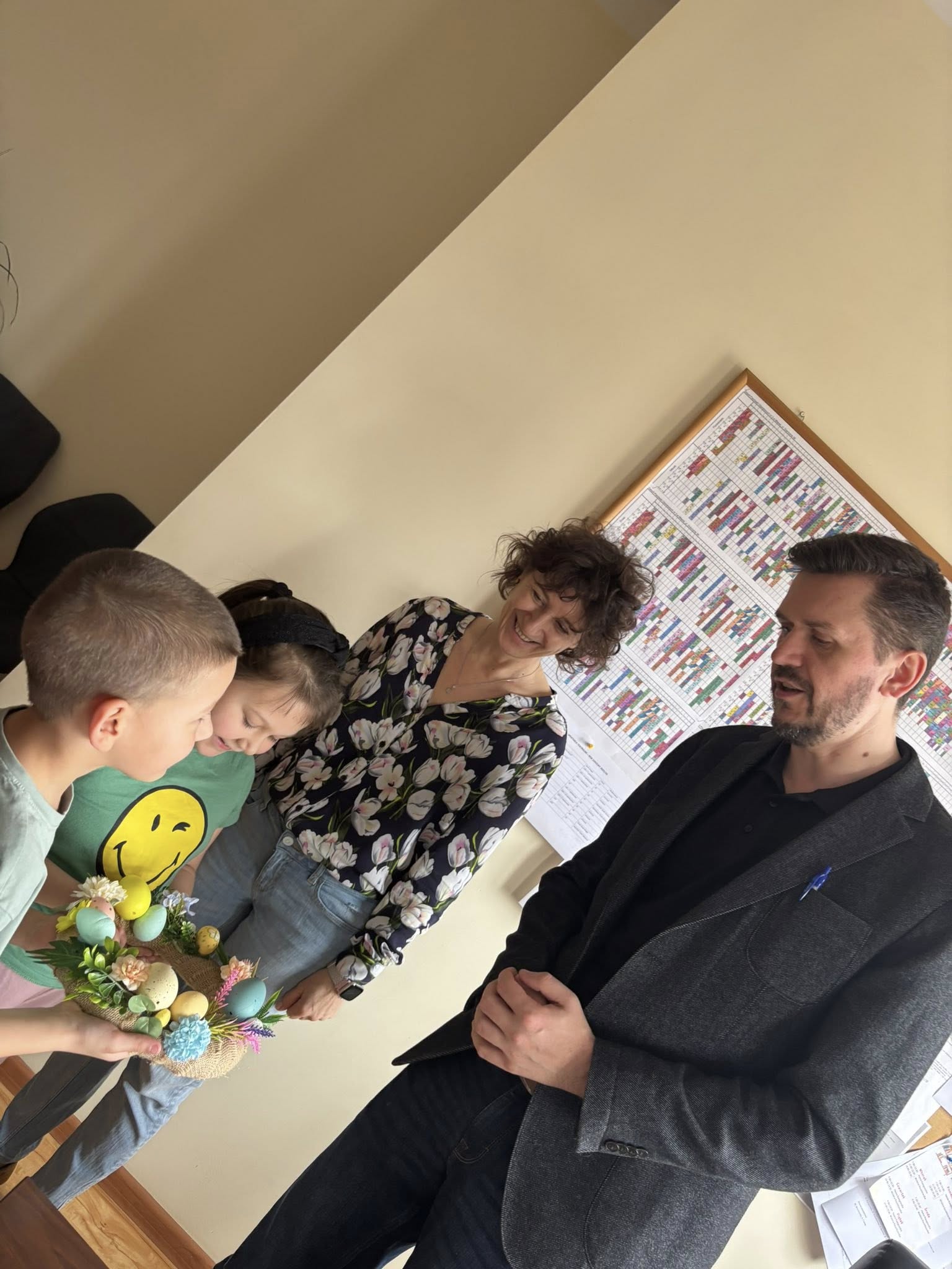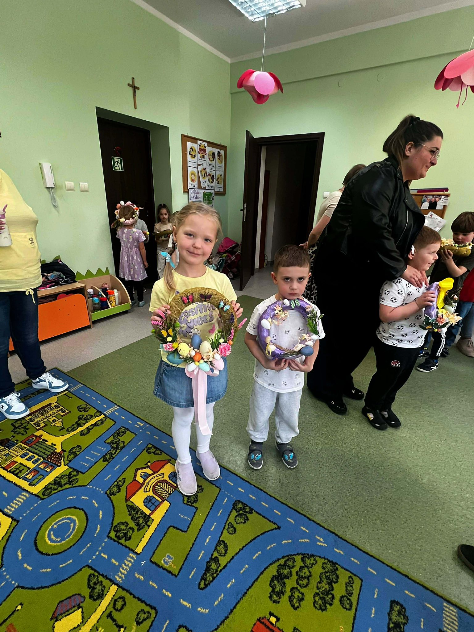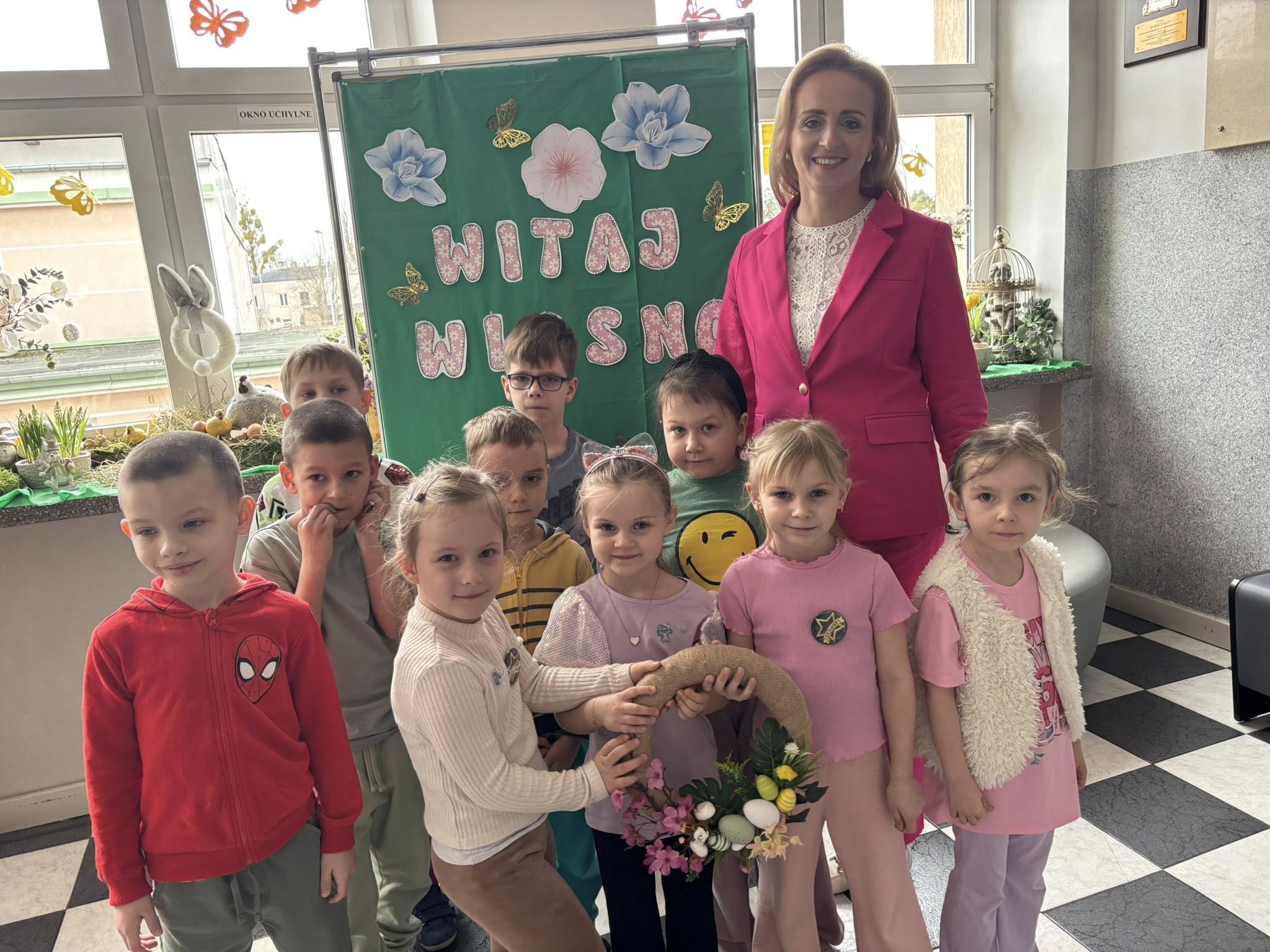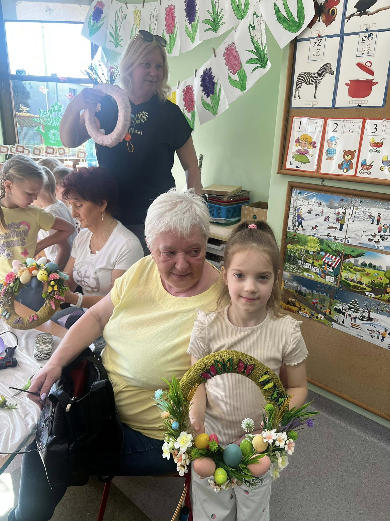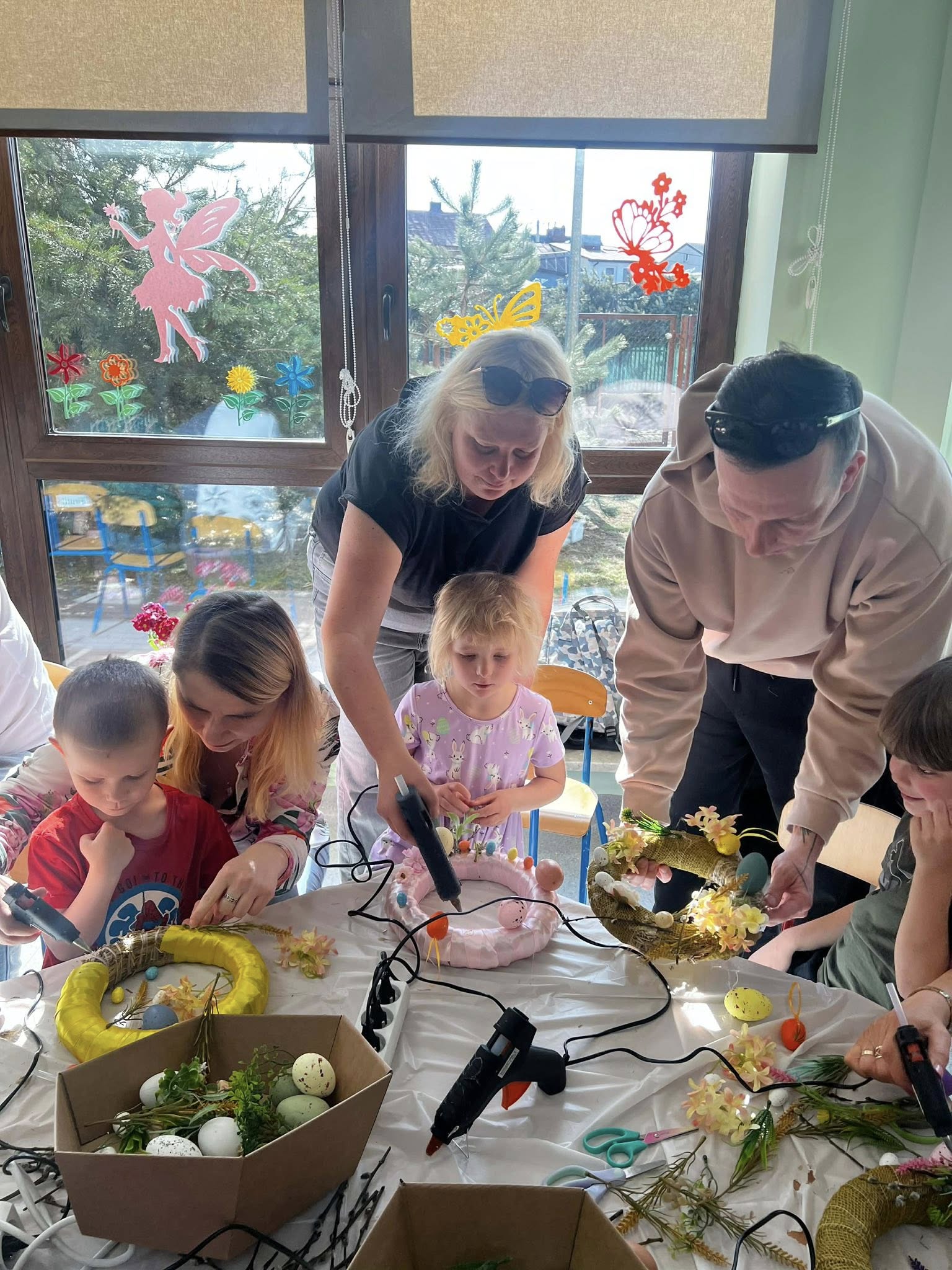W naszym przedszkolu odbyły się warsztaty wielkanocne z udziałem rodziców, co stworzyło miłą i integracyjną atmosferę. Dzieci wspólnie z rodzicami wykonywały wielkanocne wianki, ozdabiając je kolorowymi wstążkami bibułą, kwiatkami oraz elementami świątecznymi, takimi jak pisanki, kurczaczki i zajączki. Przedszkolaki chętnie zaangażowały się w pracę, wykazując się dużą pomysłowością, a obecność rodziców dawała im poczucie wsparcia i radość ze wspólnego działania. Bardzo dziękujemy Pani Annie Marchlewicz, florystce za przeprowadzenie warsztatów i cenne rady, a rodzicom za obecność i zaangażowanie