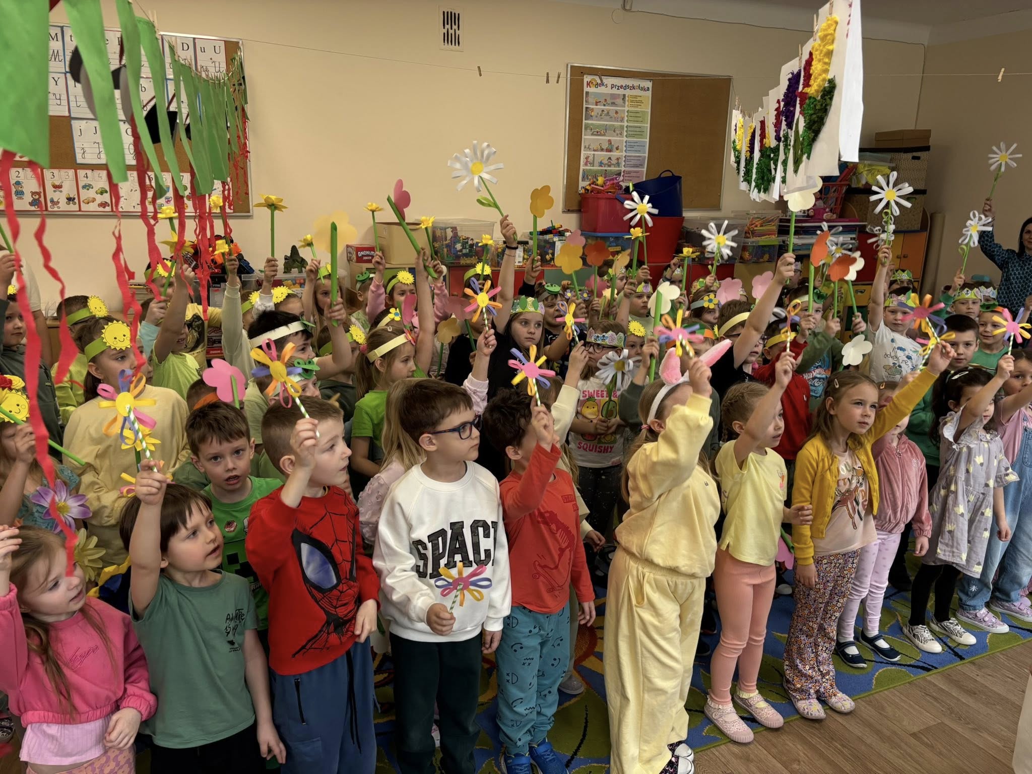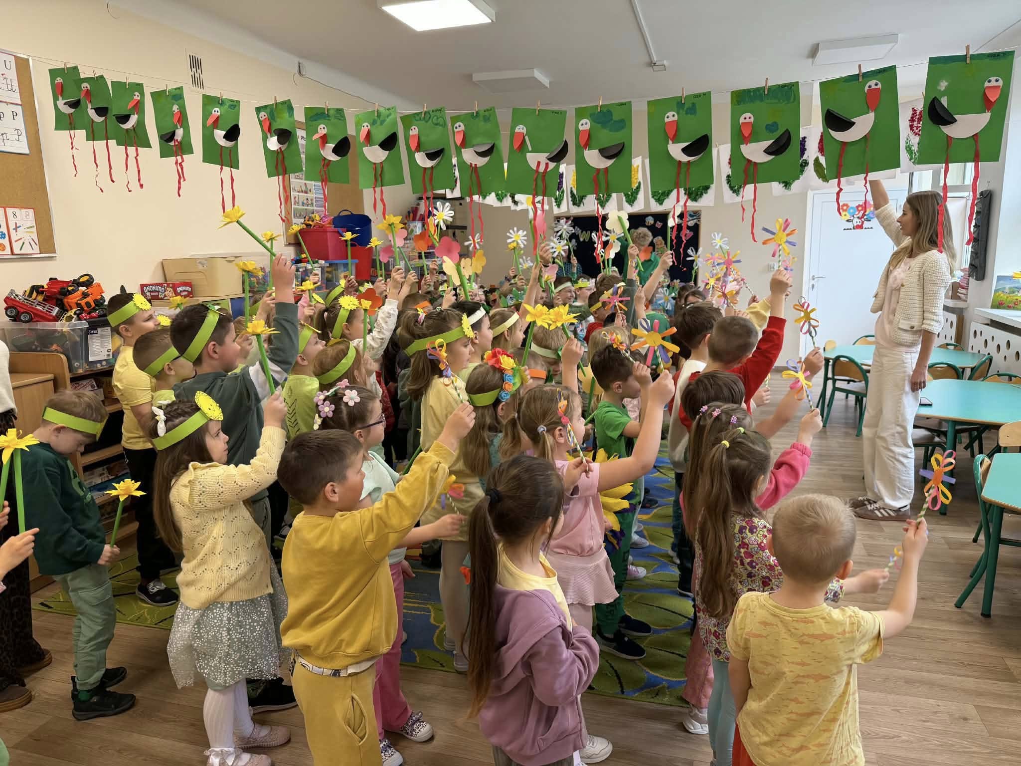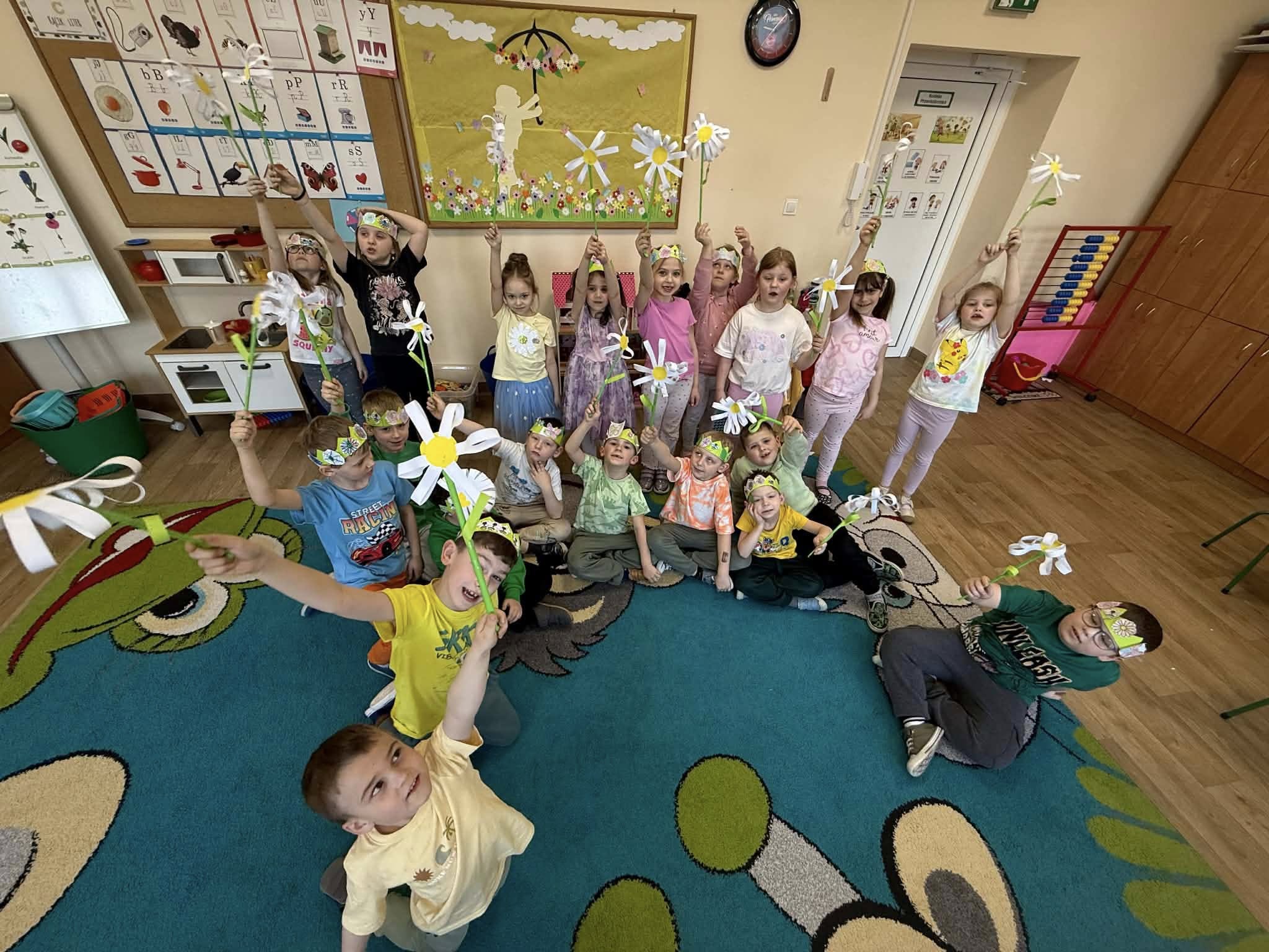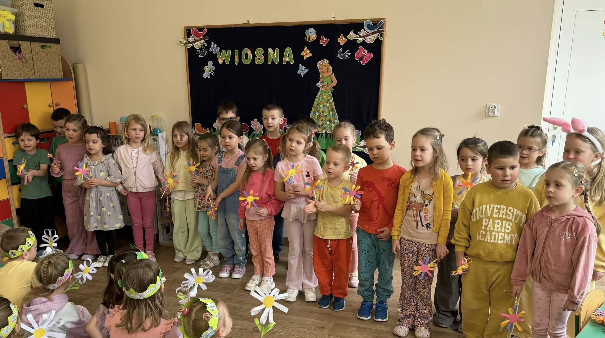 Dziś, z okazji 21 marca, dzieci z przedszkola radośnie powitały pierwszy dzień wiosny. Z tej okazji przygotowano dla nich wiele atrakcji - odbyły się konkurencje sportowe, były wiosenne zagadki, tańce oraz tematyczne prace plastyczne. Nie zabrakło również spaceru, podczas którego przedszkolaki z zaciekawieniem szukały pierwszych oznak wiosny w przyrodzie. Był to bardzo miły i pełen uśmiechu dzień. Cieszymy się, że wiosna już do nas zawitała!