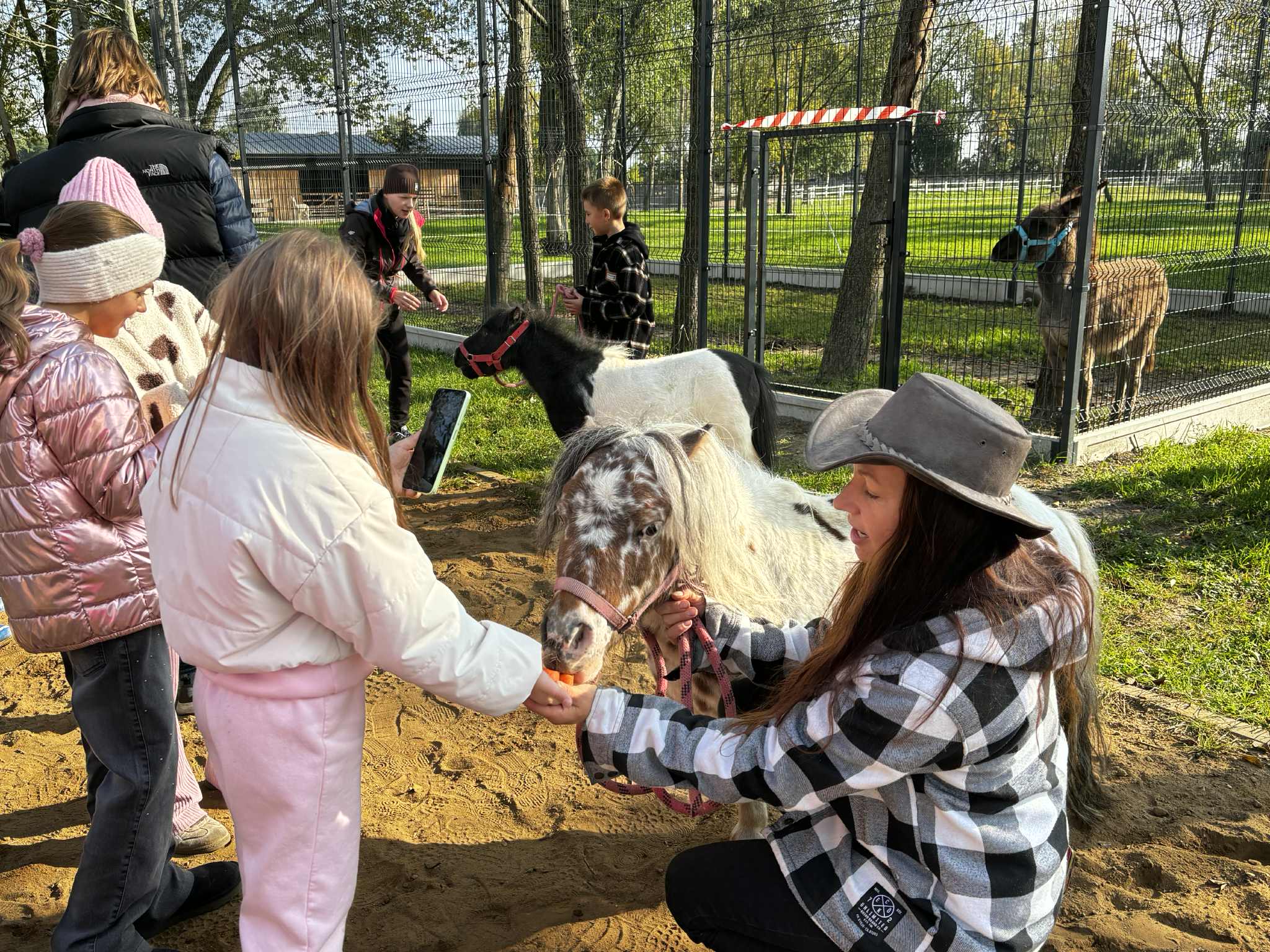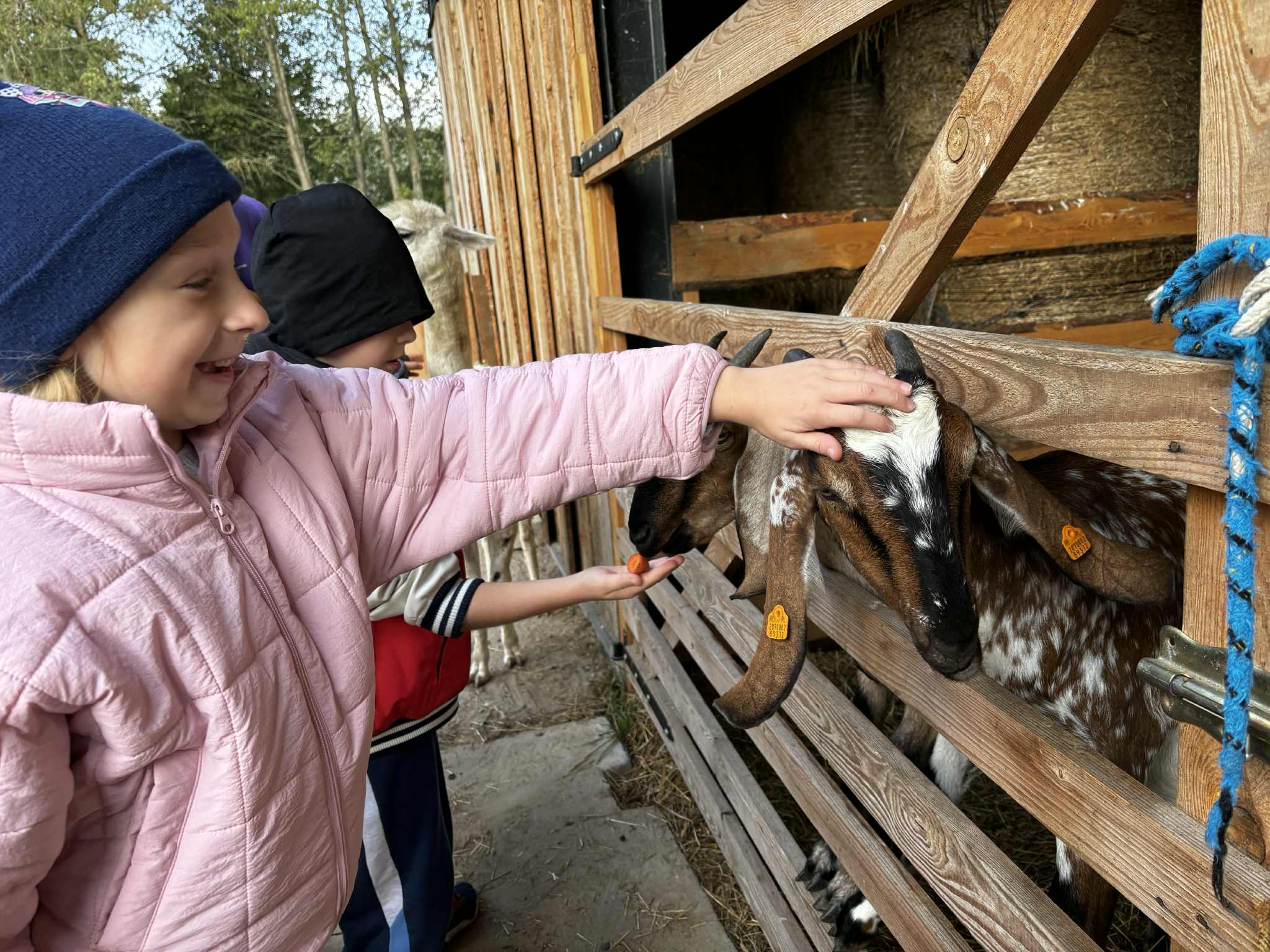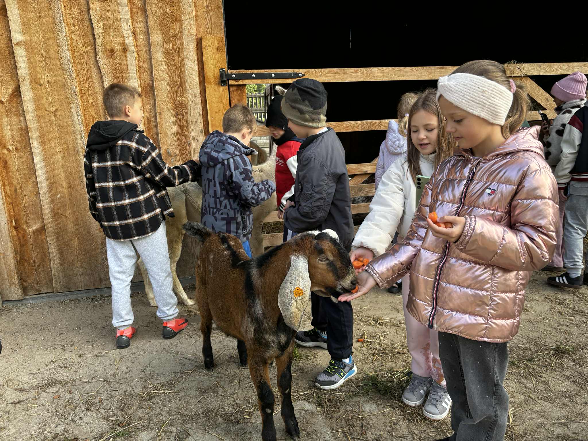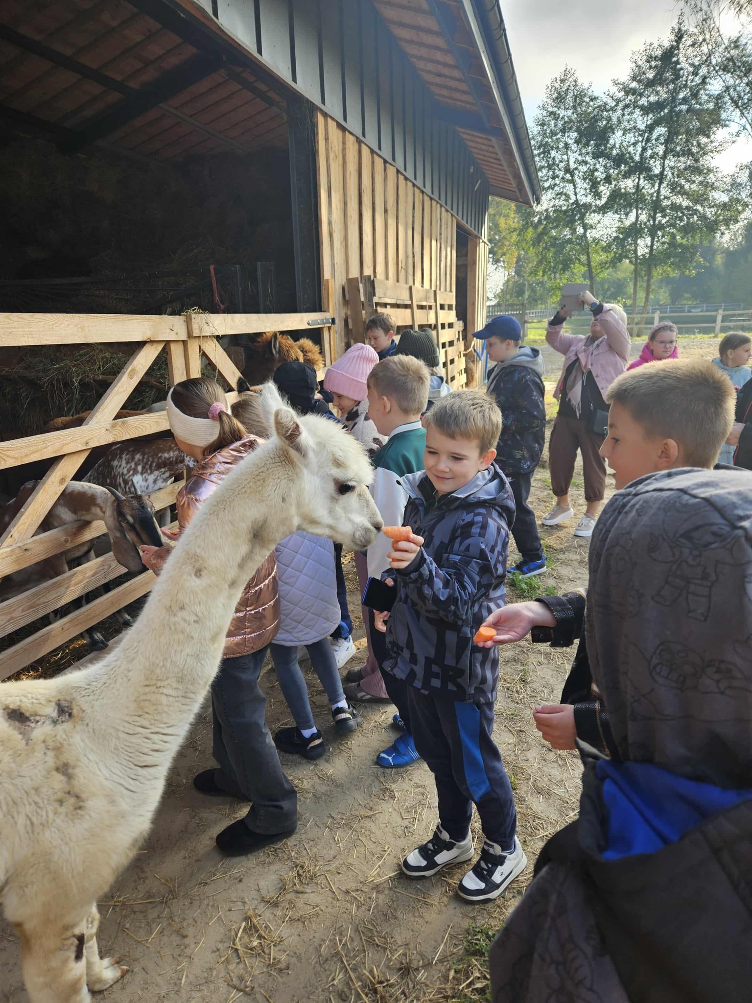Już od pierwszych chwil dzieci były zachwycone- miały okazję karmić kozy, osiołki, koniki miniaturki i alpaki, a także poznały uroczą wielbłądzicę Basię, która podbiła serca wszystkich swoją łagodnością i ciekawskim spojrzeniem.